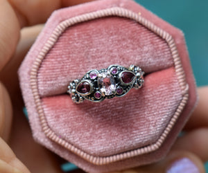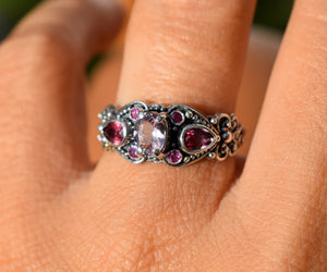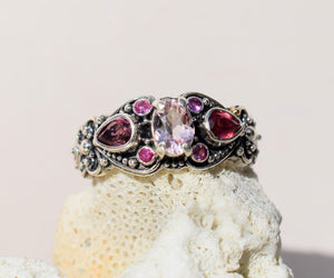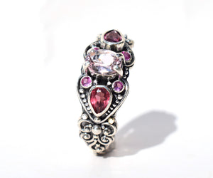 En el centro una hermosa Morganita de un color rosado suave, a los lados dos gotas de Turmalinas rosadas de color intenso y dos pequeñitos Rubies que forman un corazón, todo como una melodía de colores, entrelazado con un delicado trabajo de filigrana de plata hecha a mano.