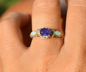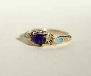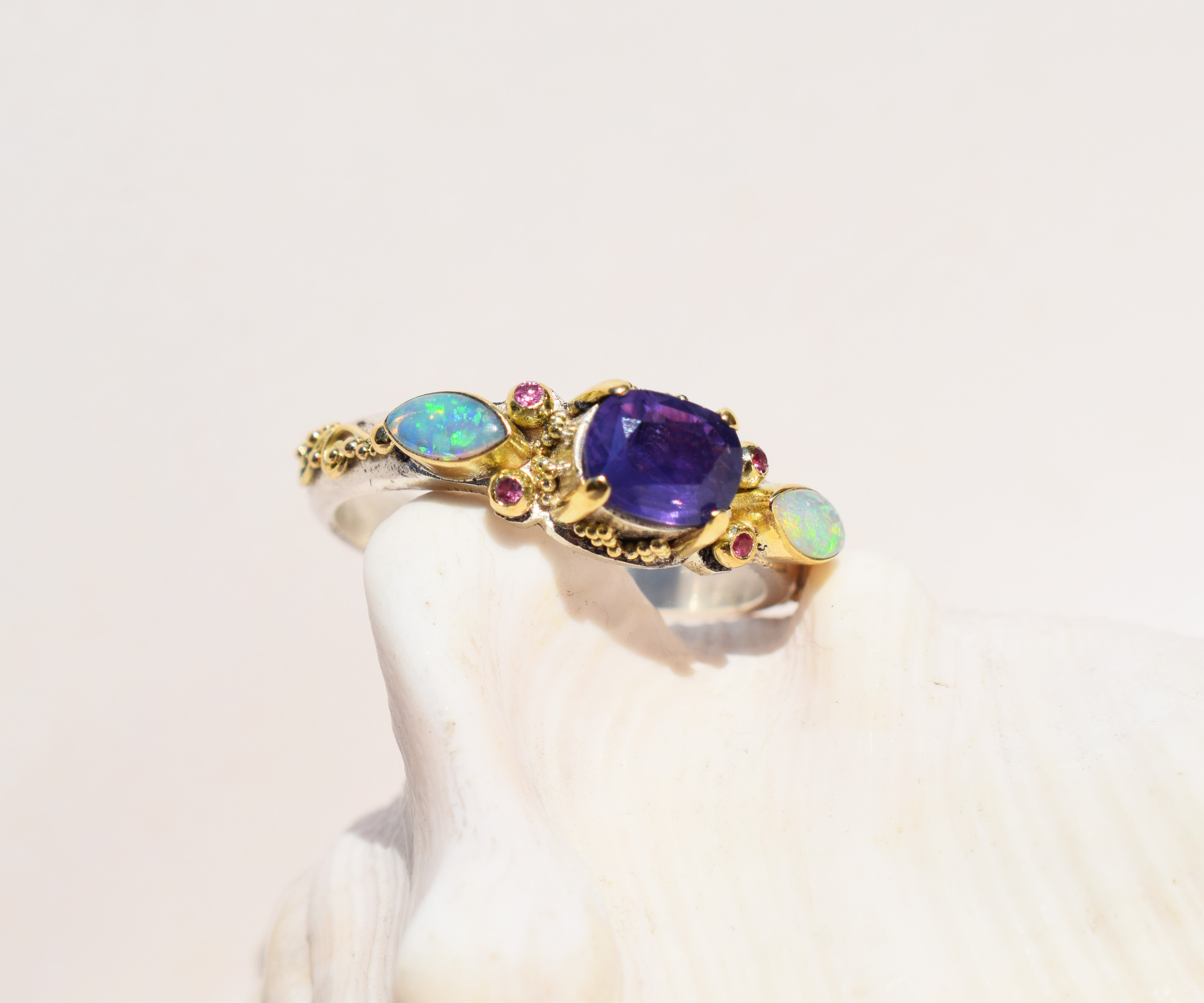 Como un resplandor suave que aparece y desaparece con la luz, este anillo tiene un zafiro purple pink en su centro, una piedra viva que revela delicados tonos rosados al moverse. A su alrededor, pequeñas bolitas de oro sostienen zafiros rosados, mientras los ópalos laterales despliegan destellos iridiscentes, casi suspendidos en el aire.