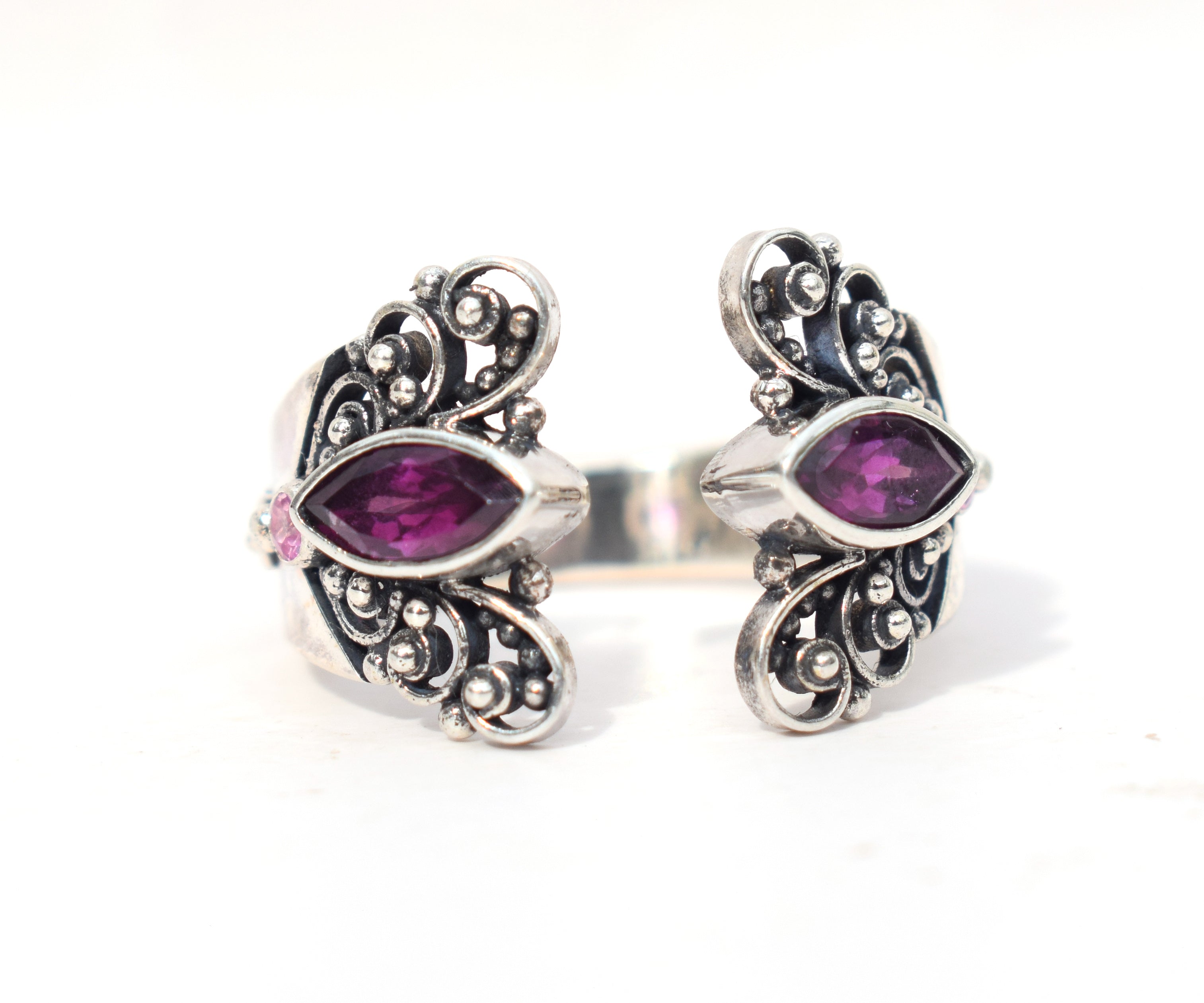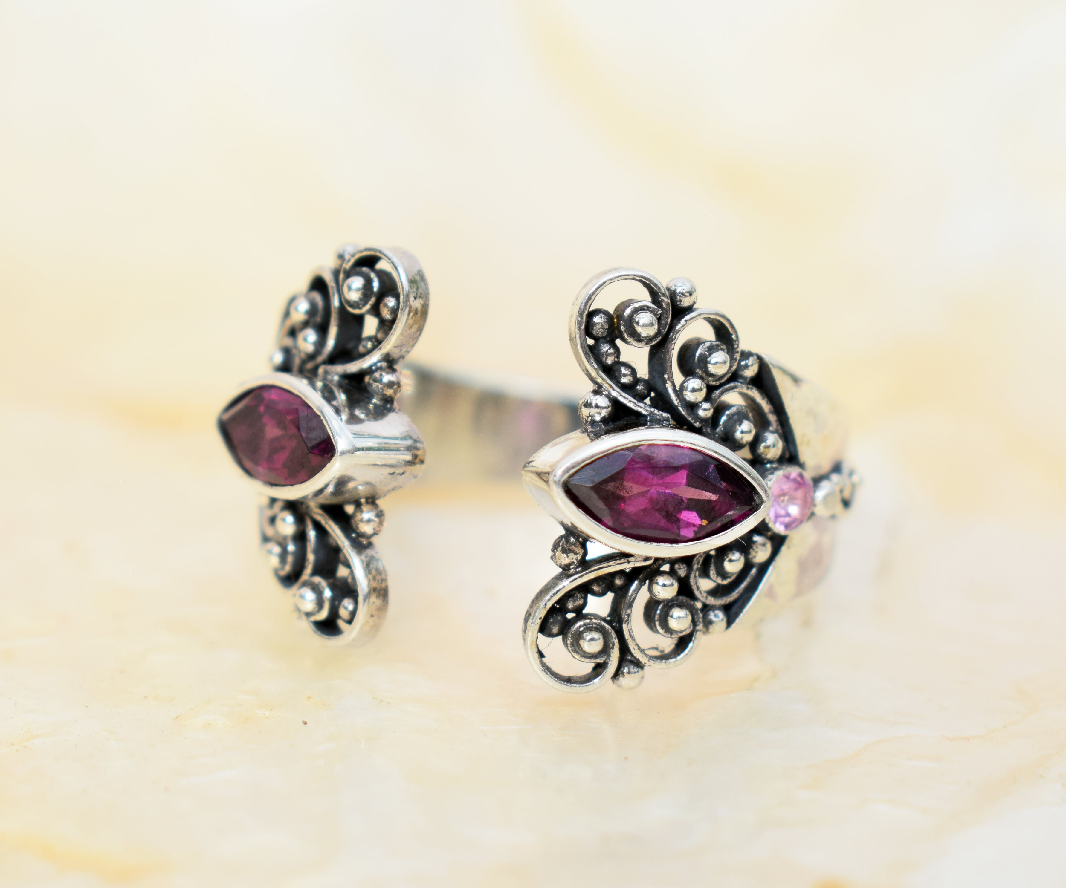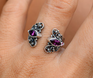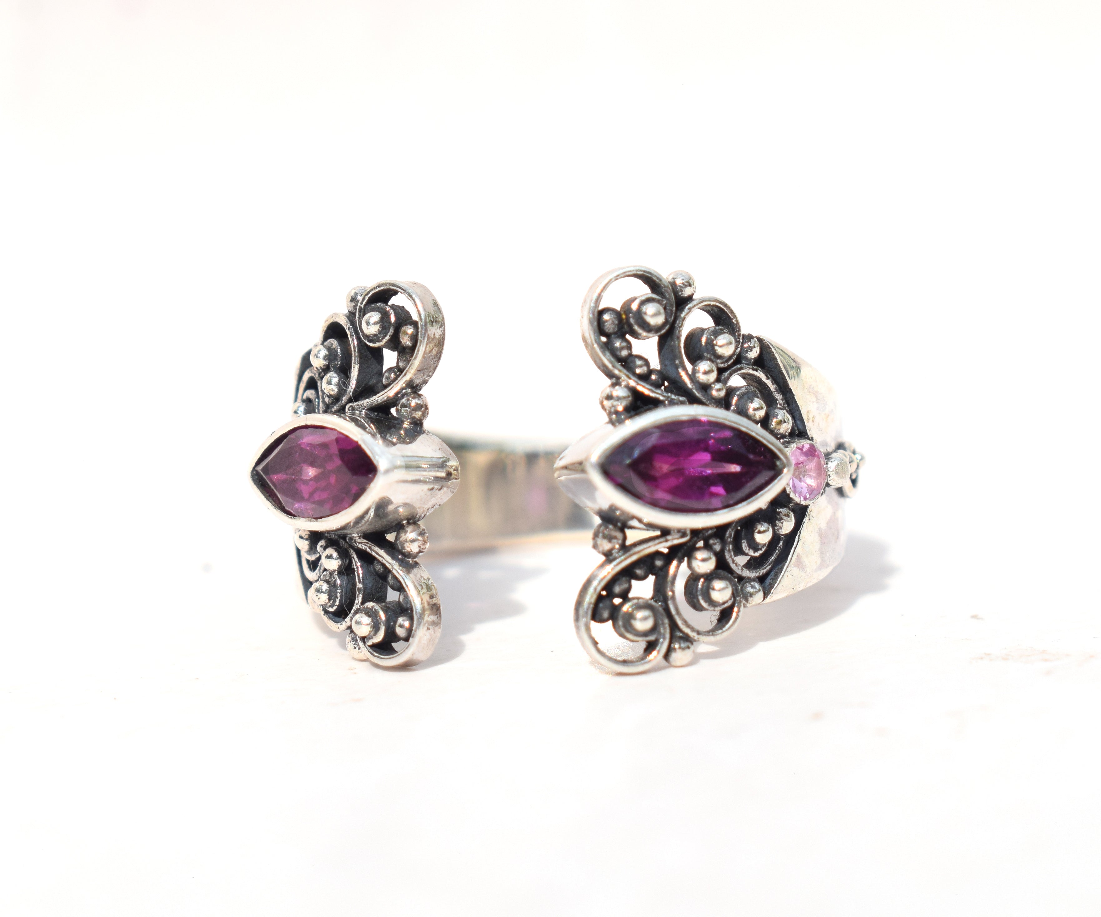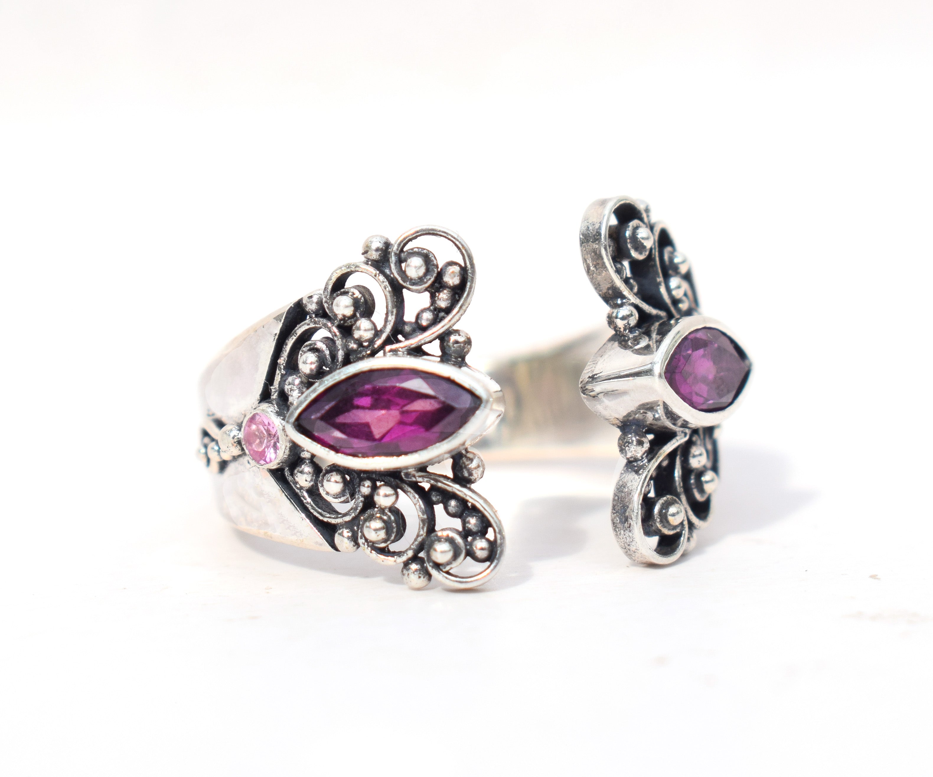 Este Anillo tiene de piedras principales dos Rodolitas corte marquise con un brillo hermoso. Las mariposas están hechas de filigrana sin fondo, muchos pequeños gránulos de plata las decoran.