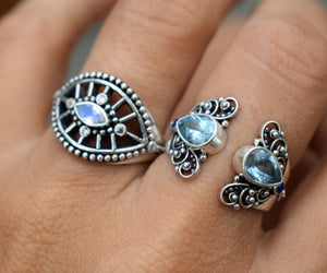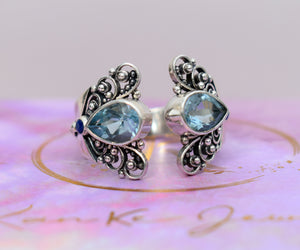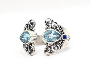 Este Anillo tiene de piedras principales dos Topacios corte gota con un brillo hermoso. Las mariposas están hechas de filigrana sin fondo, muchos pequeños gránulos de plata las decoran.