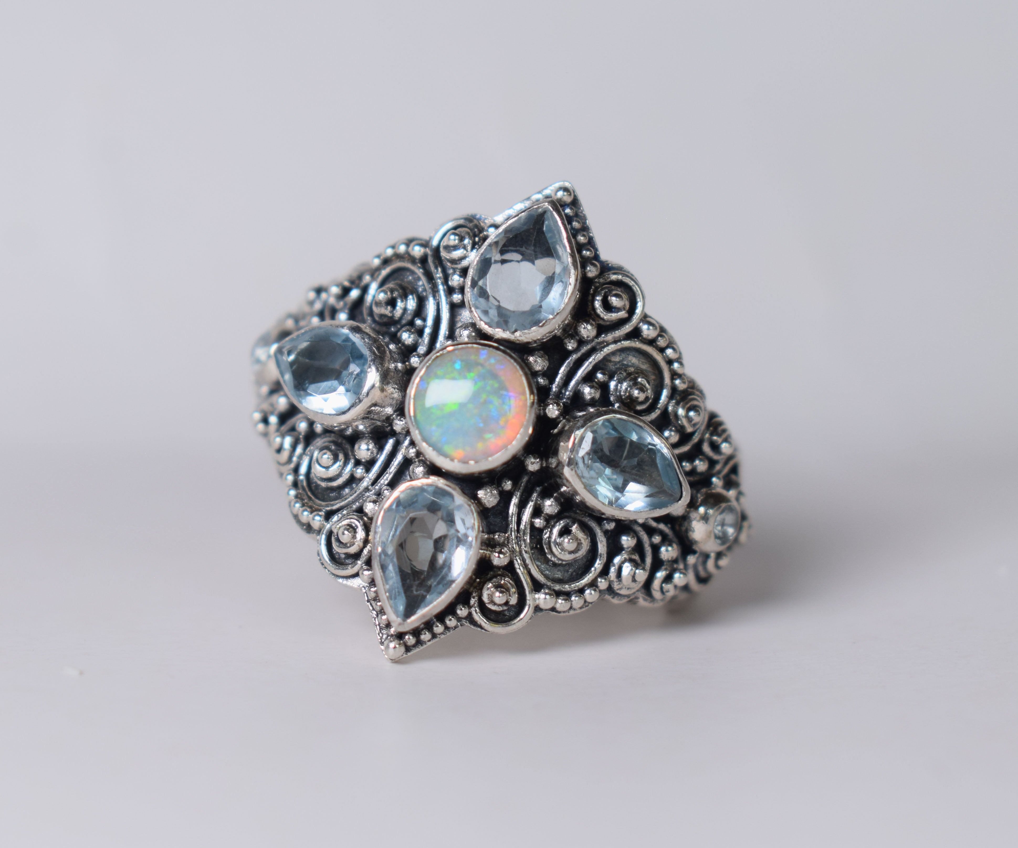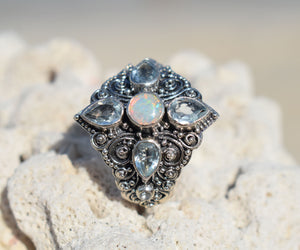 Su piedra principal es un hermoso Ópalo y esta rodeado por un delicado trabajo de filigrana y 4 Topacios que resaltan su hermoso color.