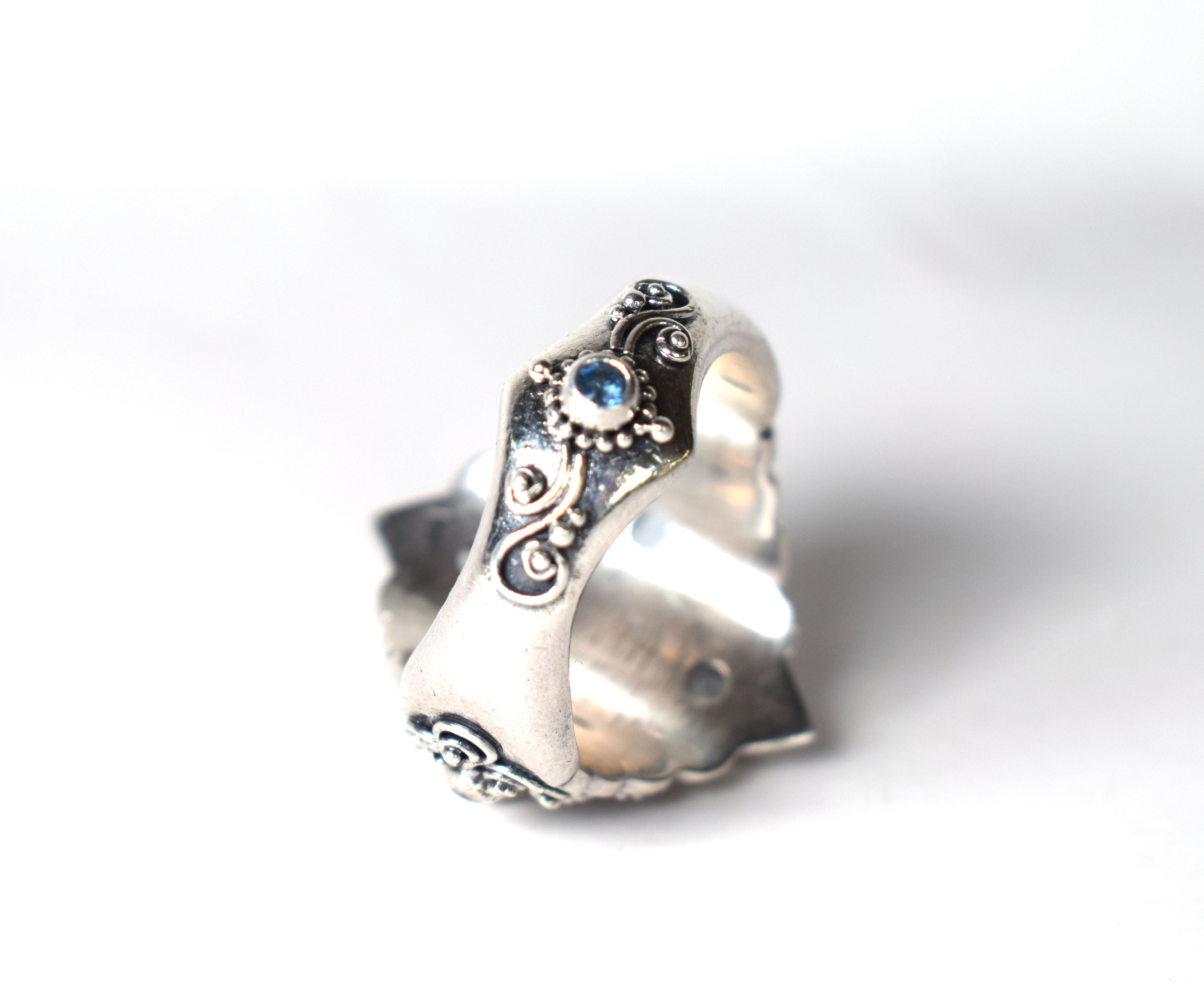 A modo de detalle para ti, tiene un Zafiro en la parte de atrás, también engastado y decorado en plata.