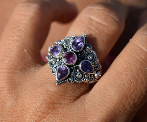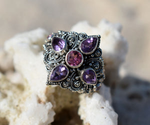 El Anillo Goa es un clásico de la de la colección India Sagrada, cada uno es único, completamente hecho a mano con una combinación de piedras diferente. Es un anillo que tiene muchas piedras y detalles hechas en filigrana de plata.