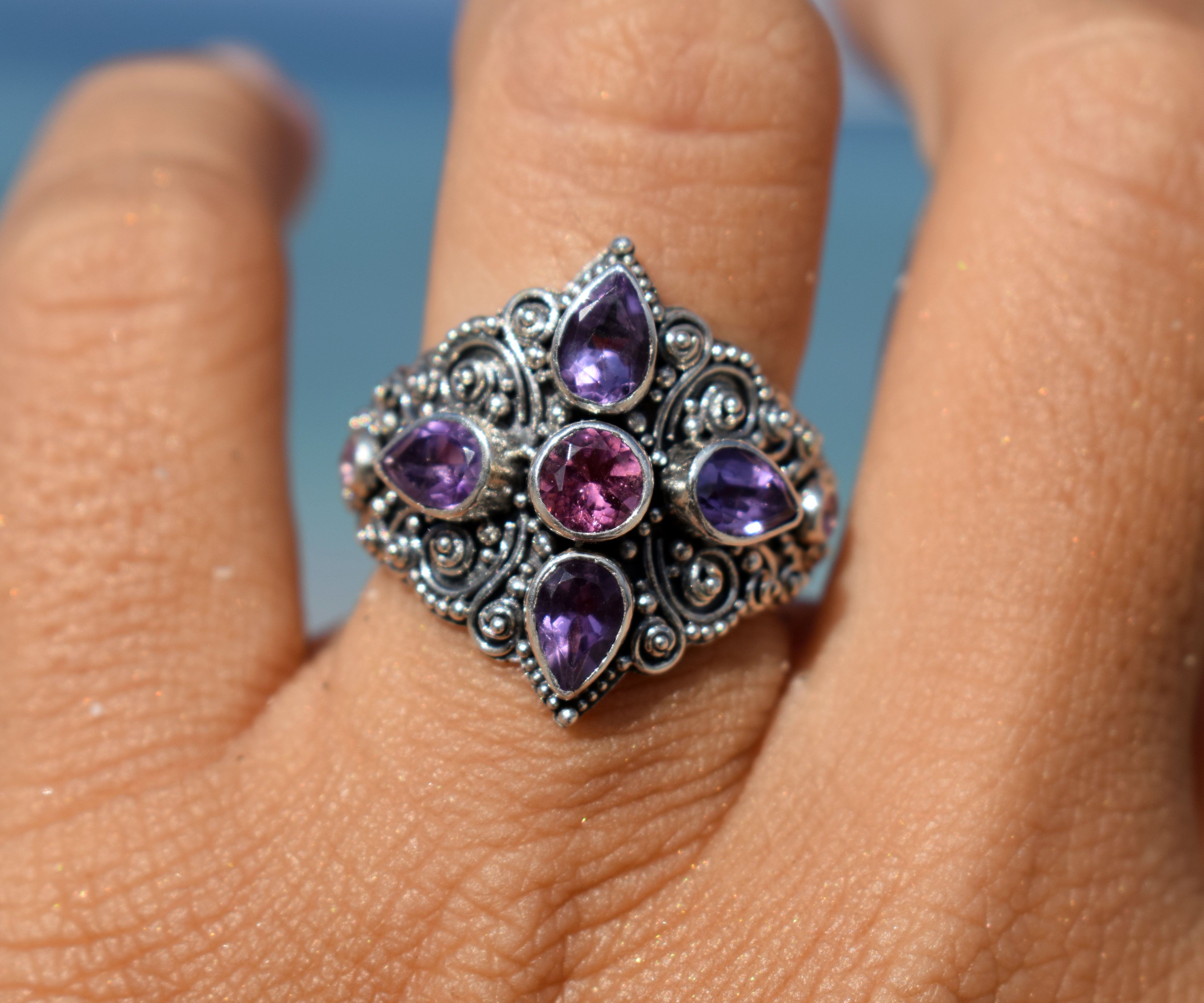 Su piedra principal es una hermosa Turmalina y esta rodeada por un delicado trabajo de filigrana y 4 Amatistas que resaltan su hermoso color.