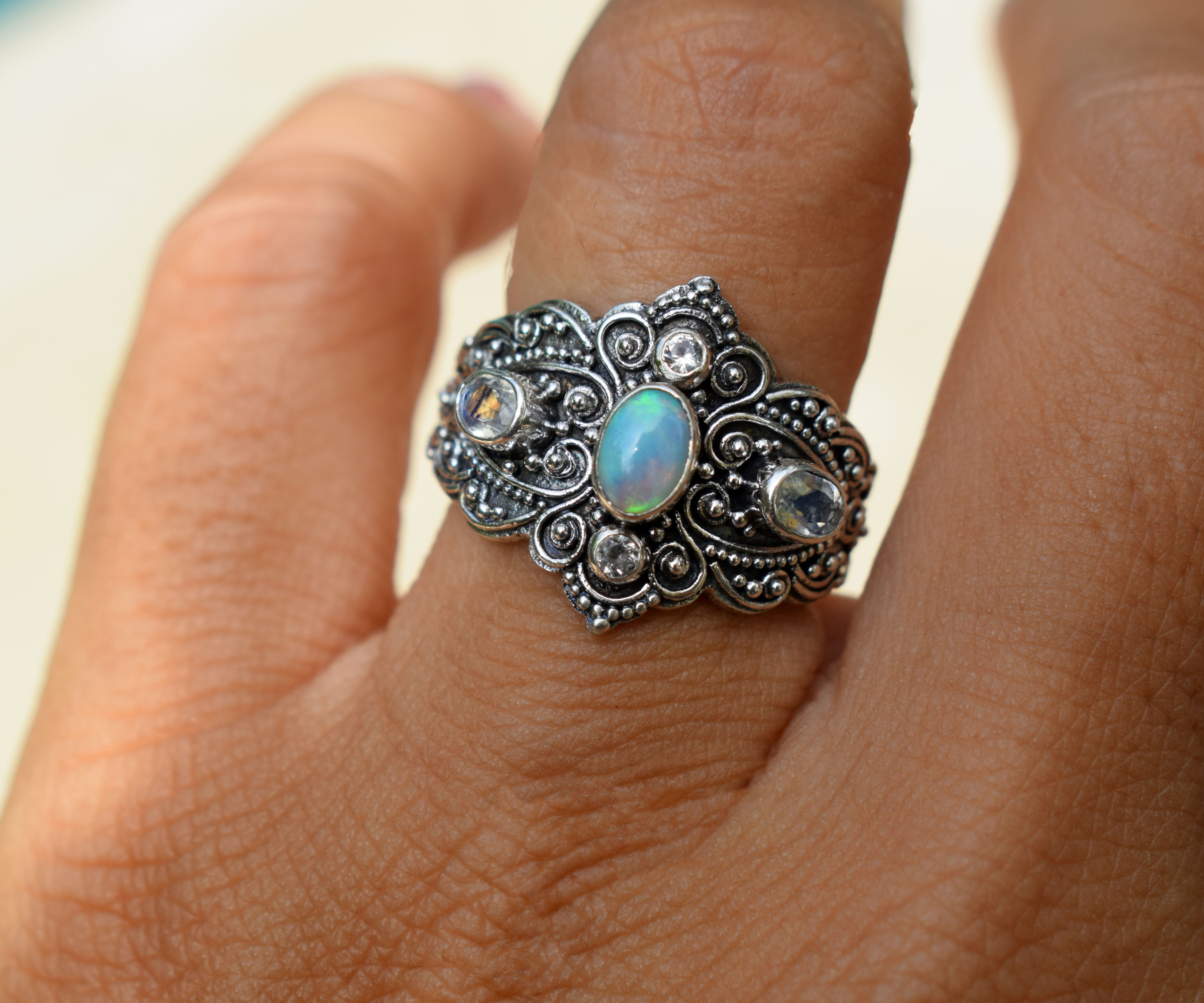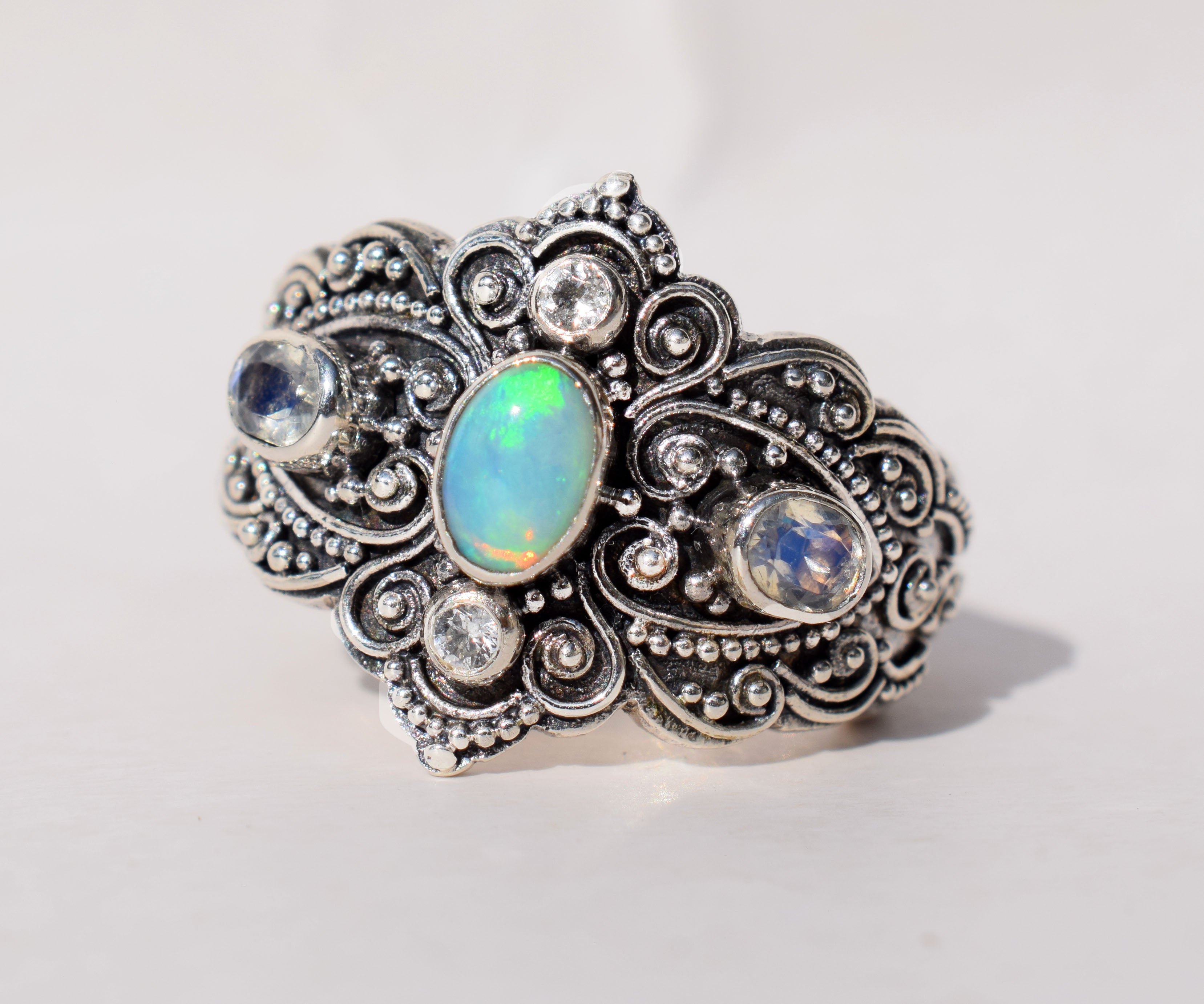 Su piedra principal es un brillante Ópalo en el centro,  lo acompañan dos Piedras Luna y dos Topacios que a su vez están rodeadas de filigrana y gránulos de plata, por el otro lado una Tanzanita brilla como un detalle para ti.