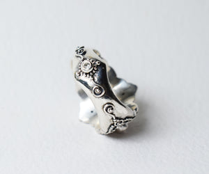 Este anillo tiene un delicado trabajo de filigrana de plata que va dibujando formas inspiradas en India.