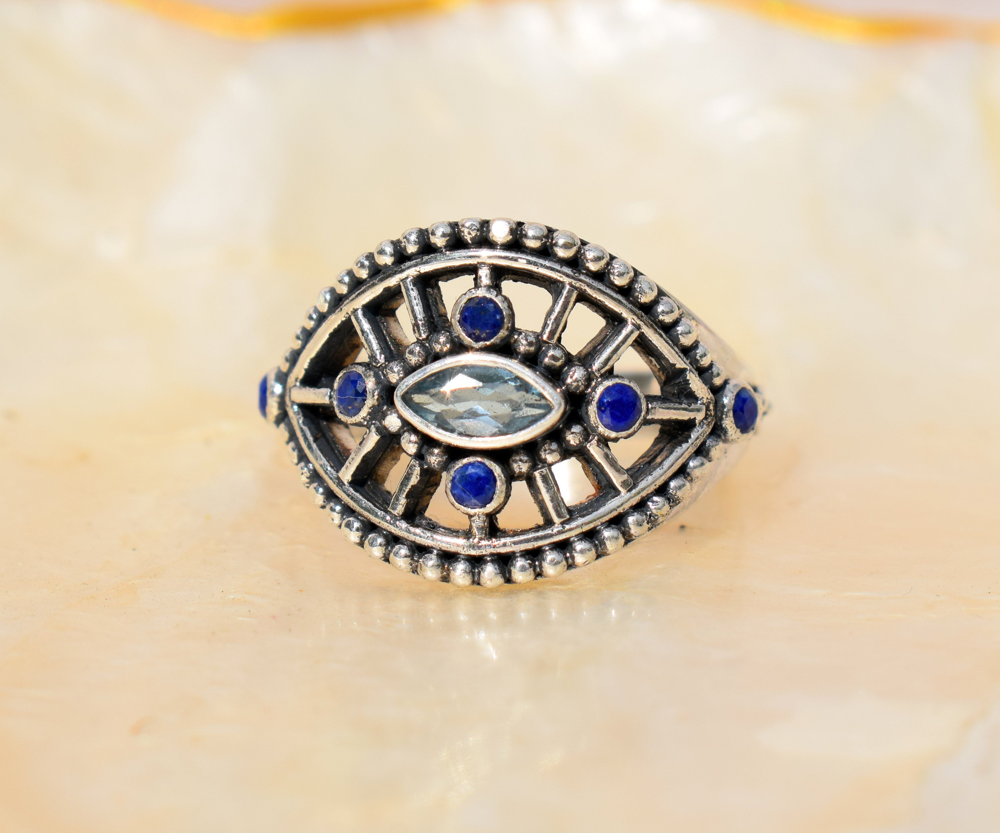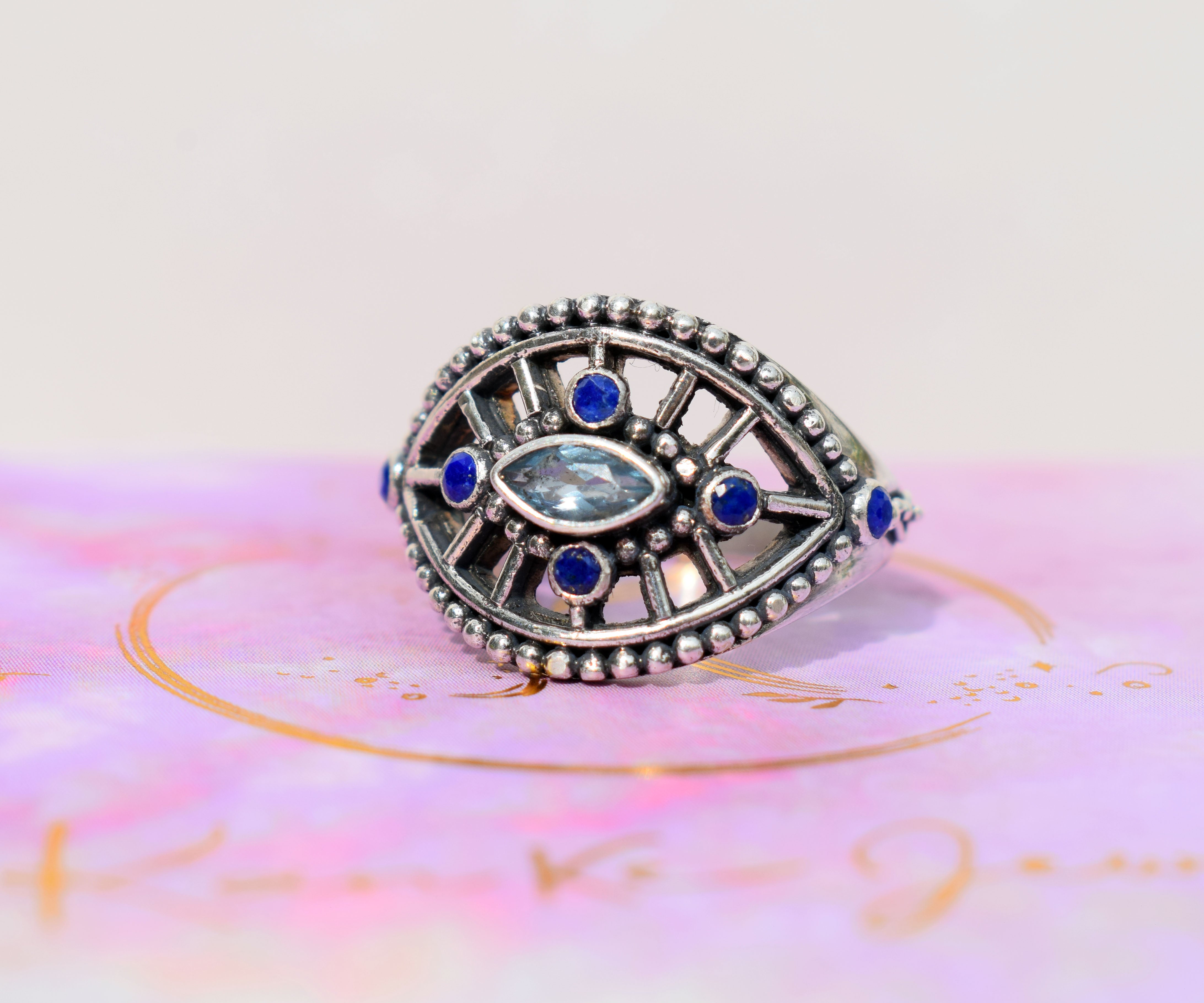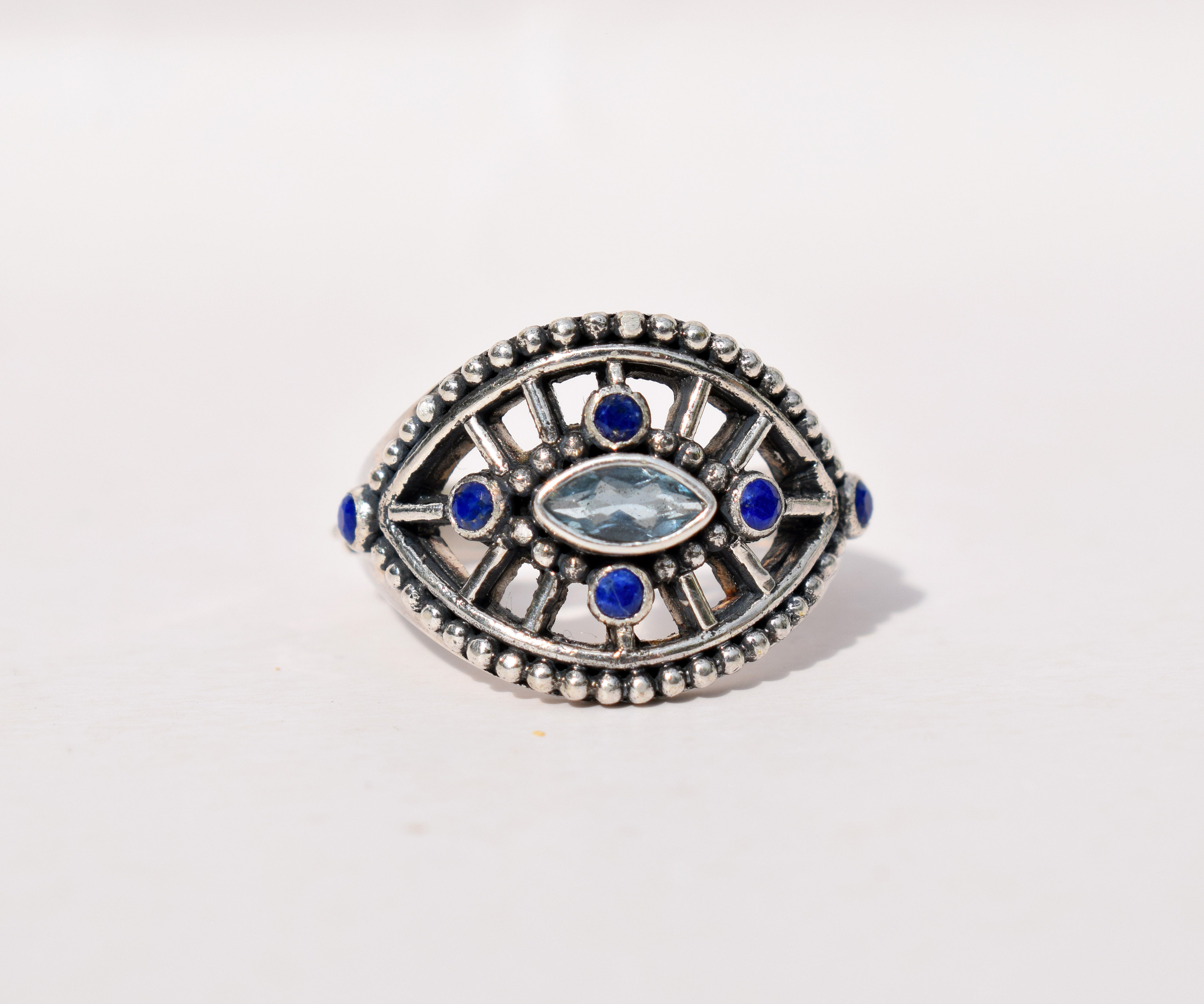 Este Anillo completamente hecho a mano, tiene en el centro un Aguamarina corte marquise, rodeada de pequeñas bolitas de plata y en 4 de ellas un Lapislazuli engastado como un punto de luz. Toda la forma del ojito es calado y rodeado de gránulos de plata. Hacia los lados tiene otros dos puntos de luz decorados con orgánicas formas hechas en filigrana.