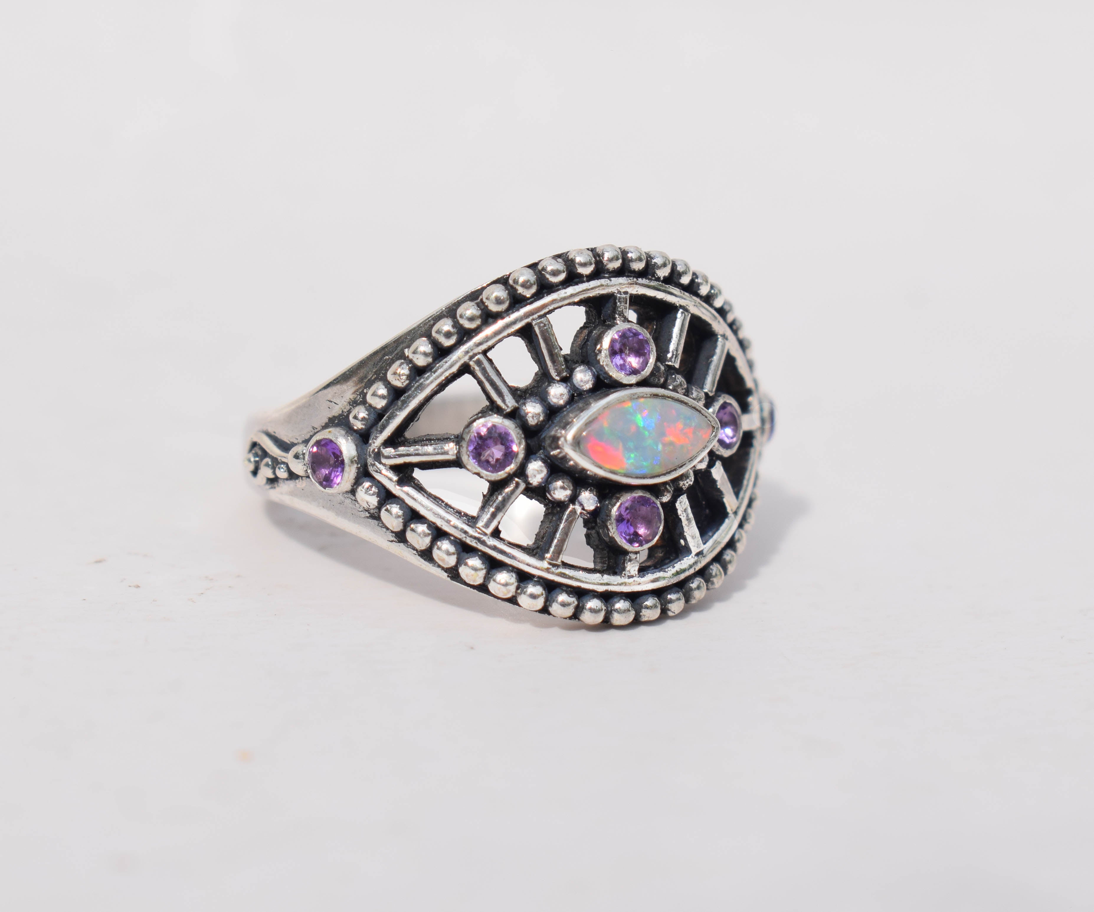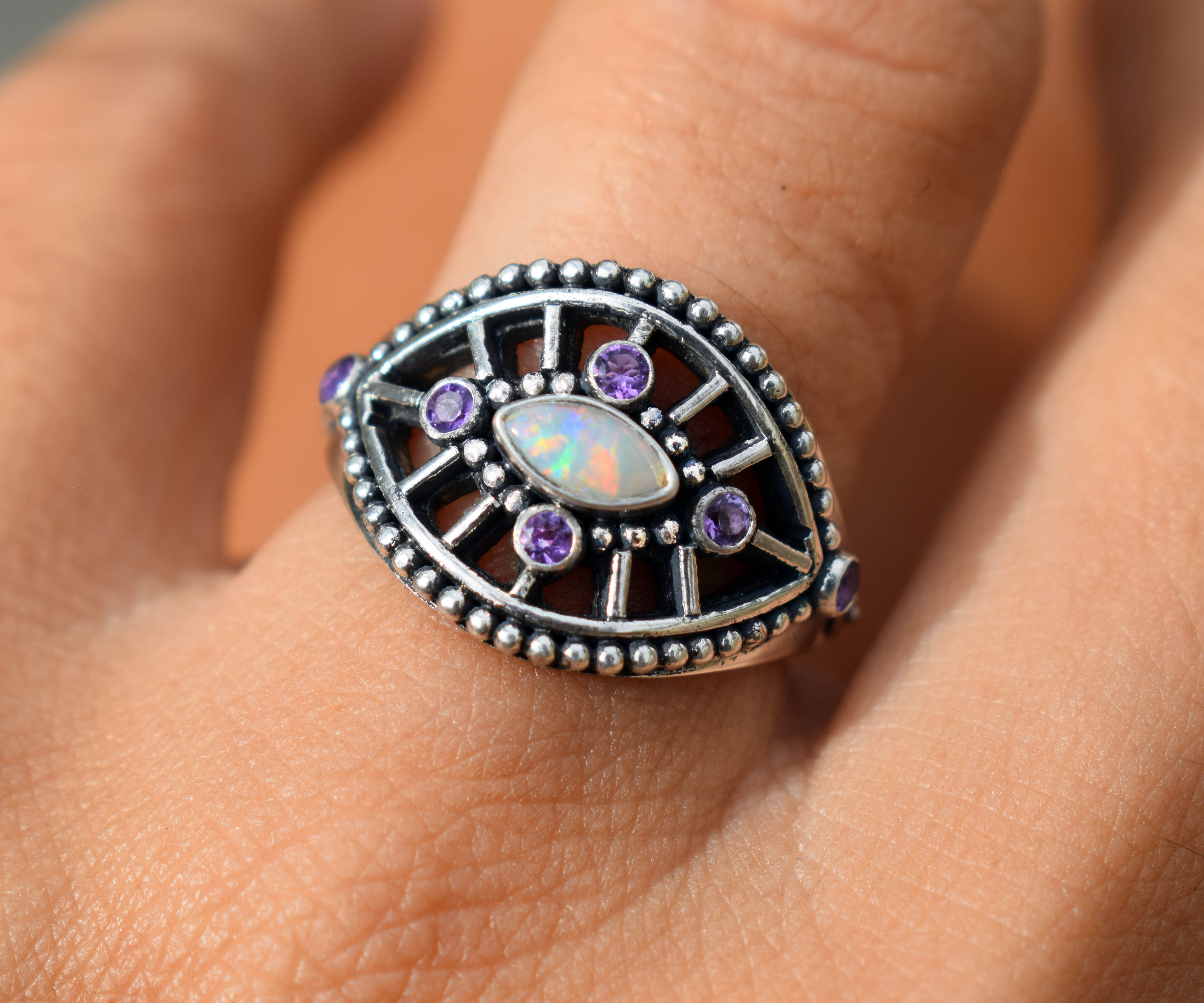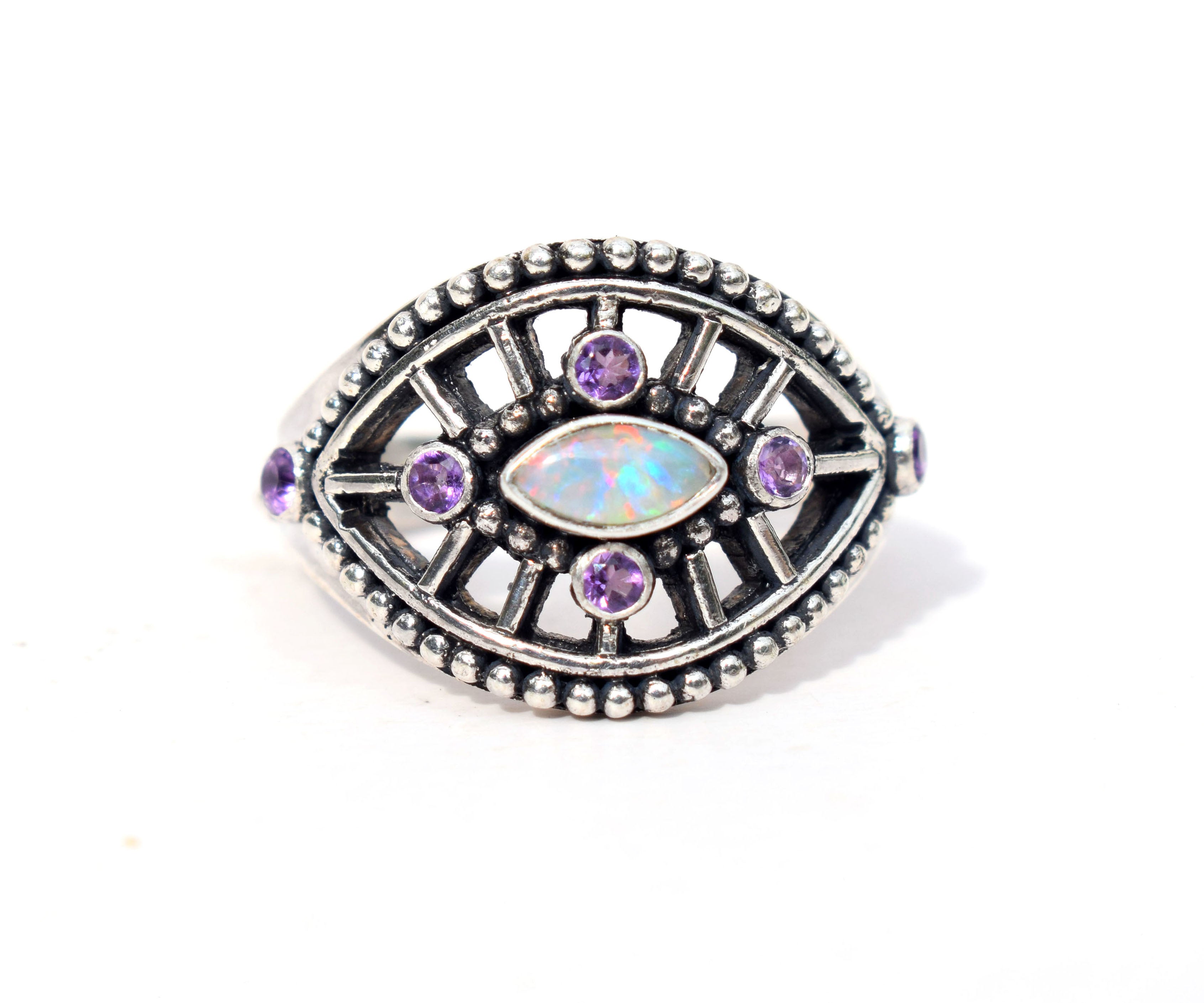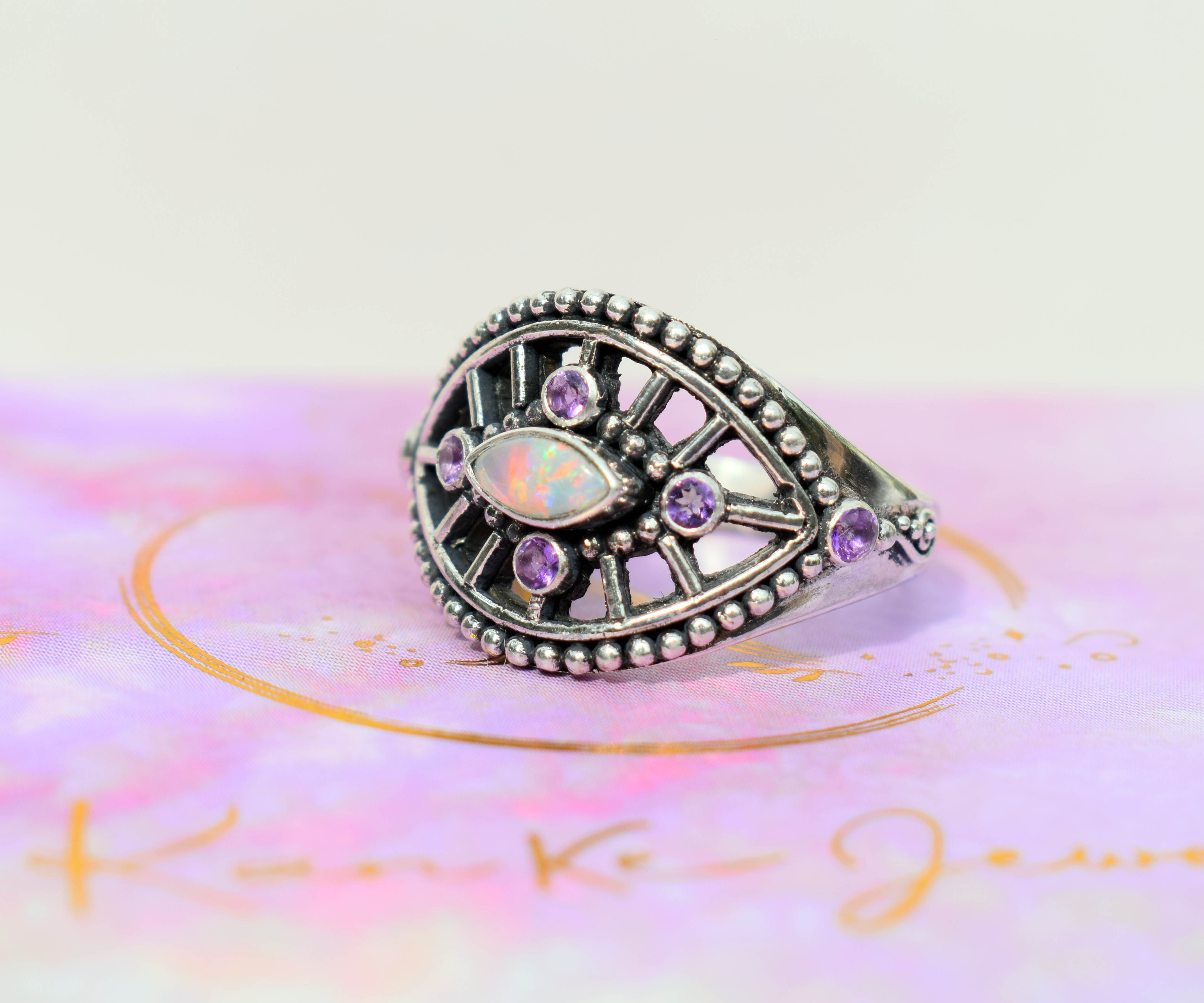 Este Anillo completamente hecho a mano, tiene en el centro un Ópalo, rodeado de pequeñas bolitas de plata y en 4 de ellas una Amatista engastada como un punto de luz. Toda la forma del ojito es calado y rodeado de gránulos de plata. Hacia los lados tiene otros dos puntos de luz decorados con orgánicas formas hechas en filigrana.