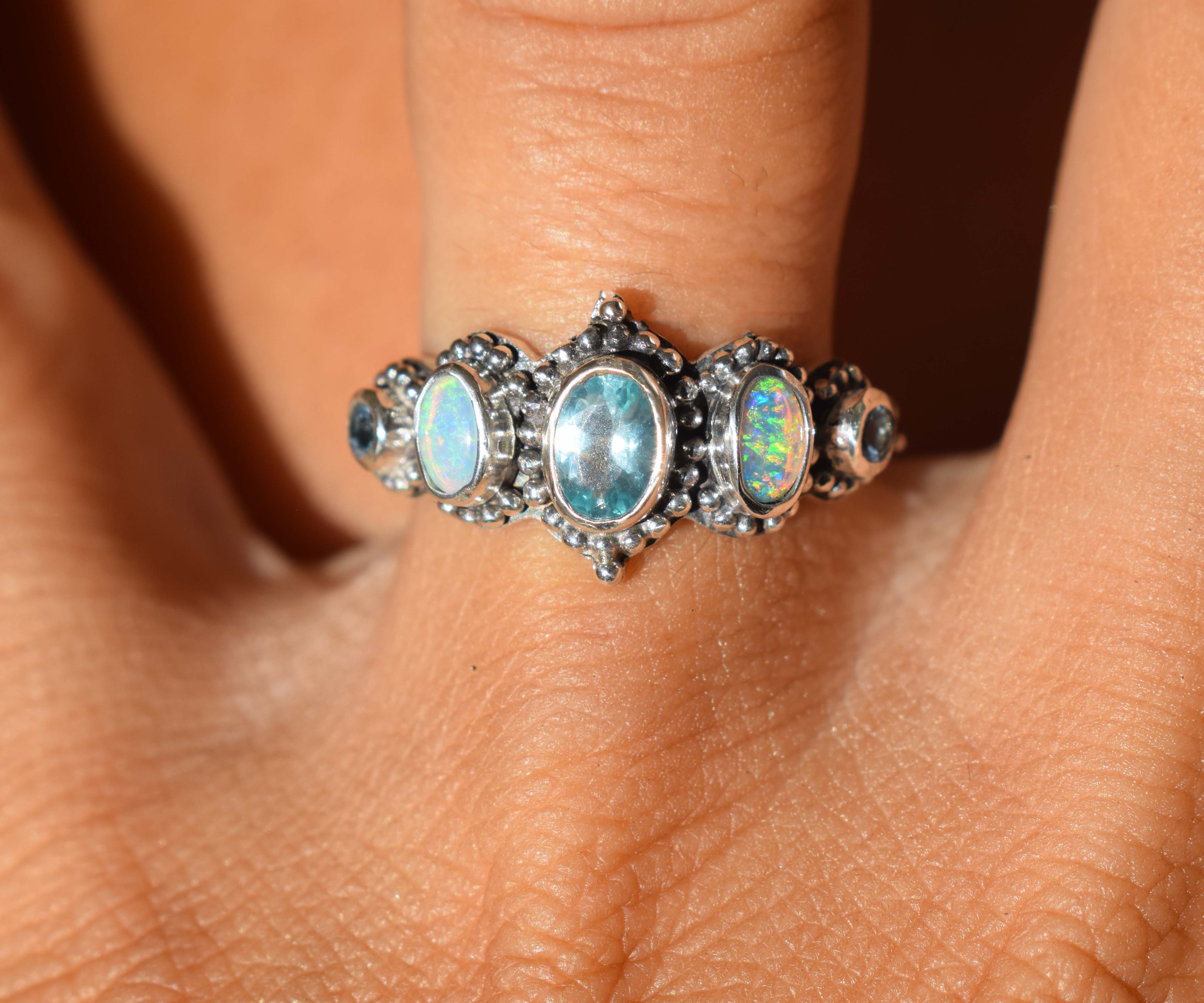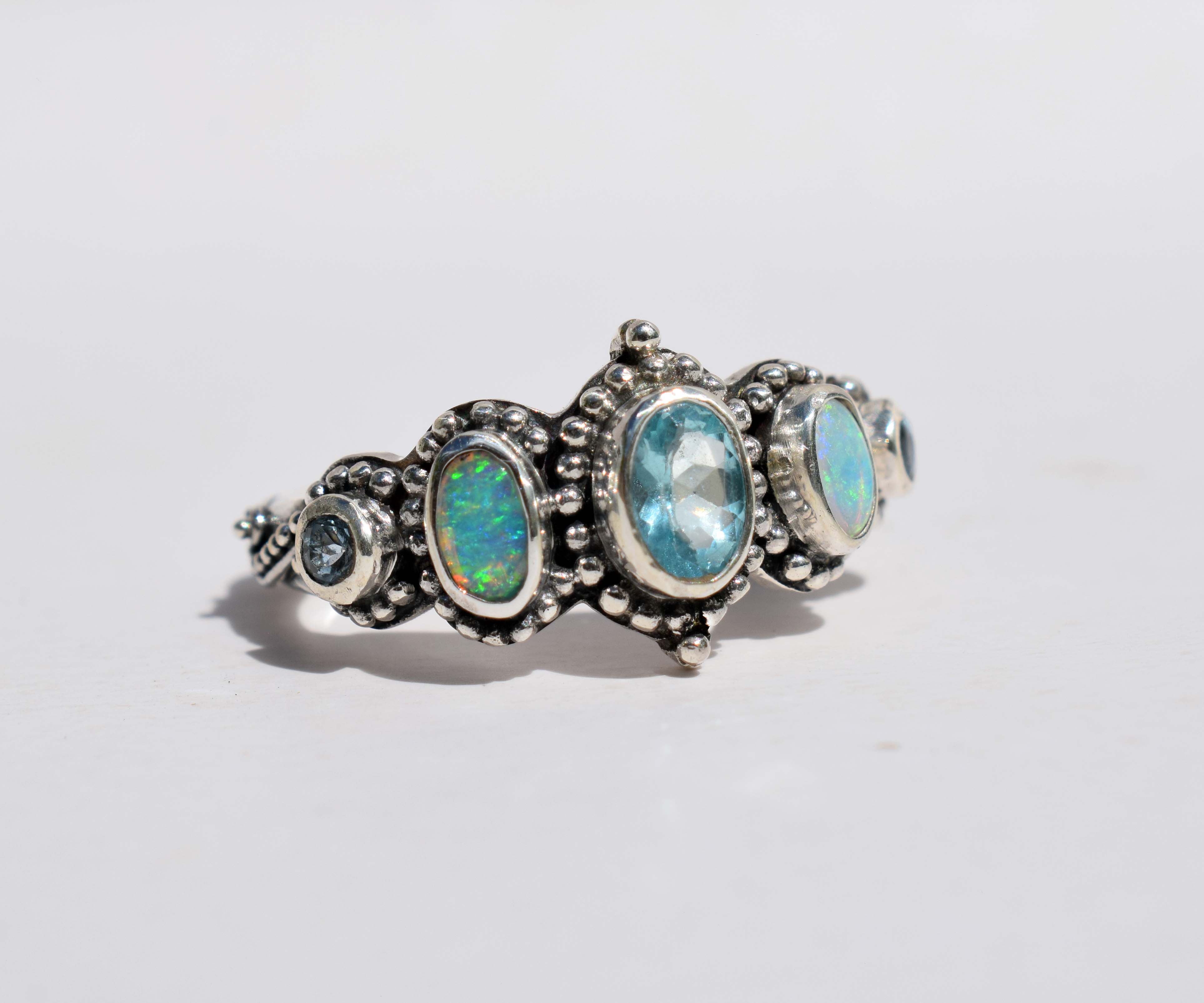 Una Apatita color turquesa en el centro, rodeada de gránulos de plata, la siguen dos Ópalos de tonos muy turquesas  y luego unas brillantes Aguamarinas, que forman una combinación perfecta para este anillo en los tonos del mar.