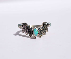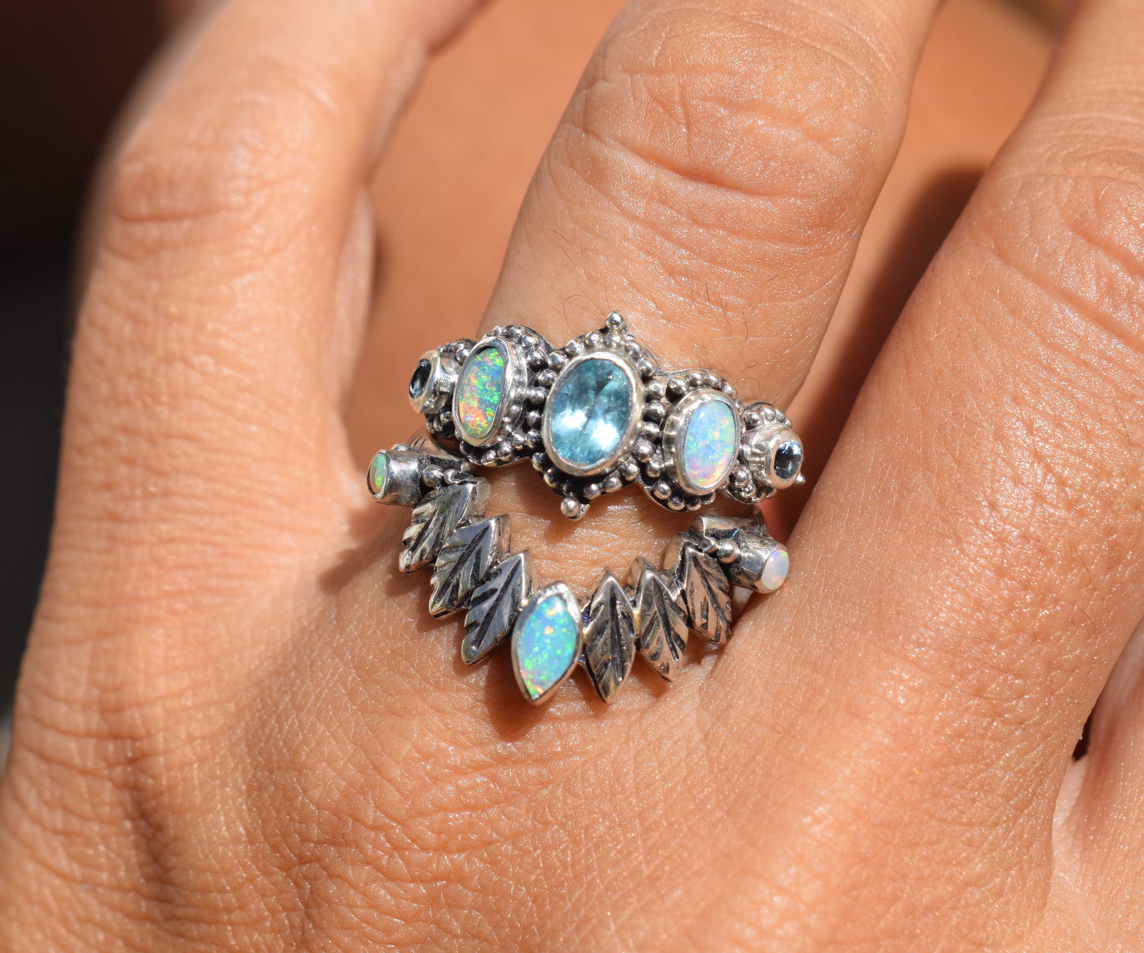La hoja central de esta corona de Pocahontas es un Ópalo Australiano multicolor y las demás hojitas están talladas. A los lados otros pequeños Ópalos para llenar de brillos este anillo.