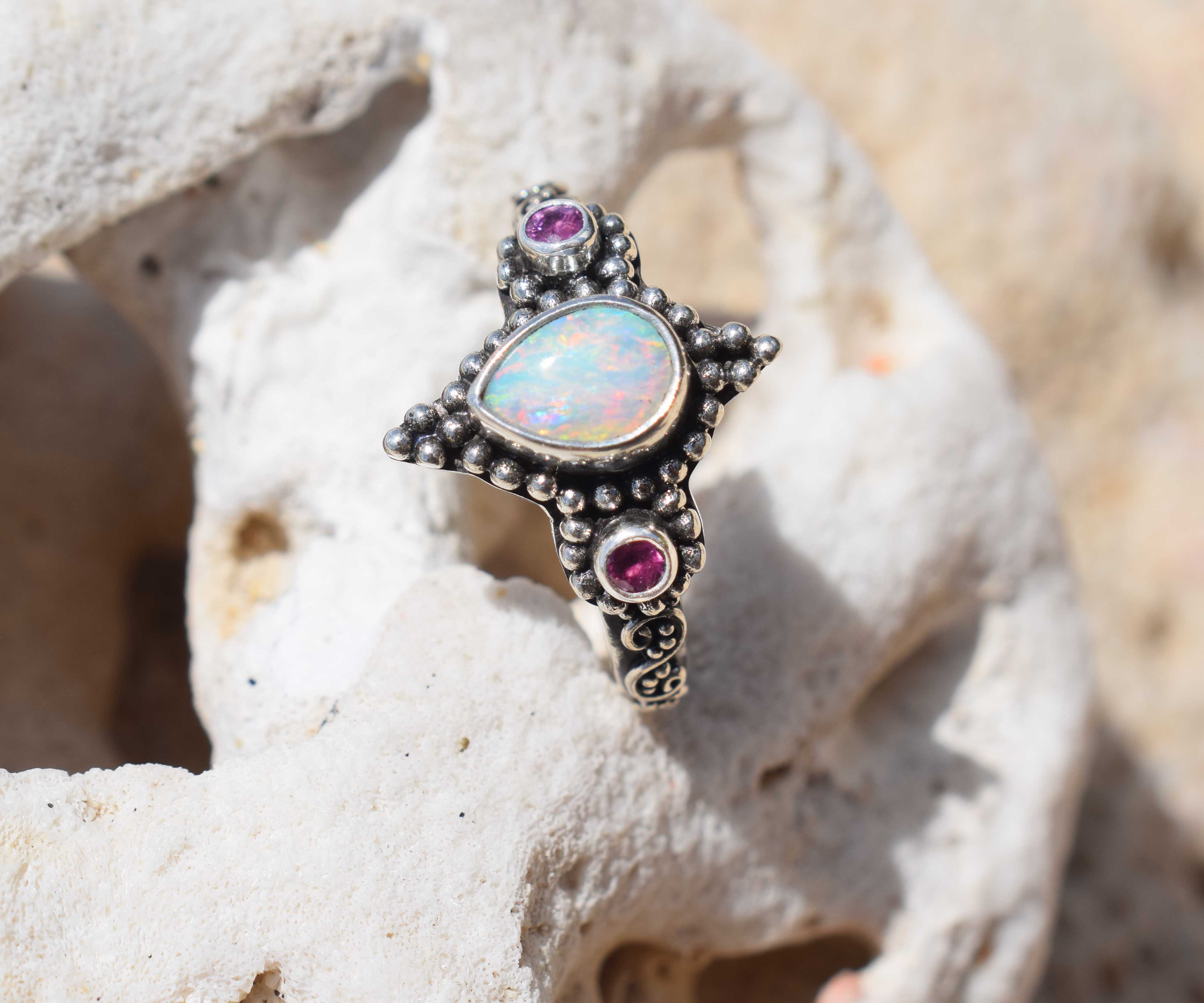 Un delicado trabajo de filigrana en plata, resalta en el centro un hermoso y brillante Ópalo Australiano A cada lado un Rubí que hacen resaltar la belleza de la piedra central. Todas las piedras están rodeadas de gránulos de plata.