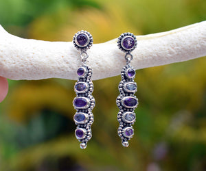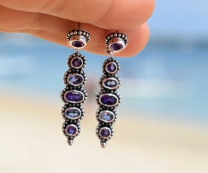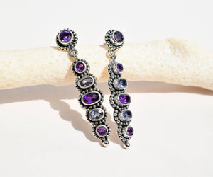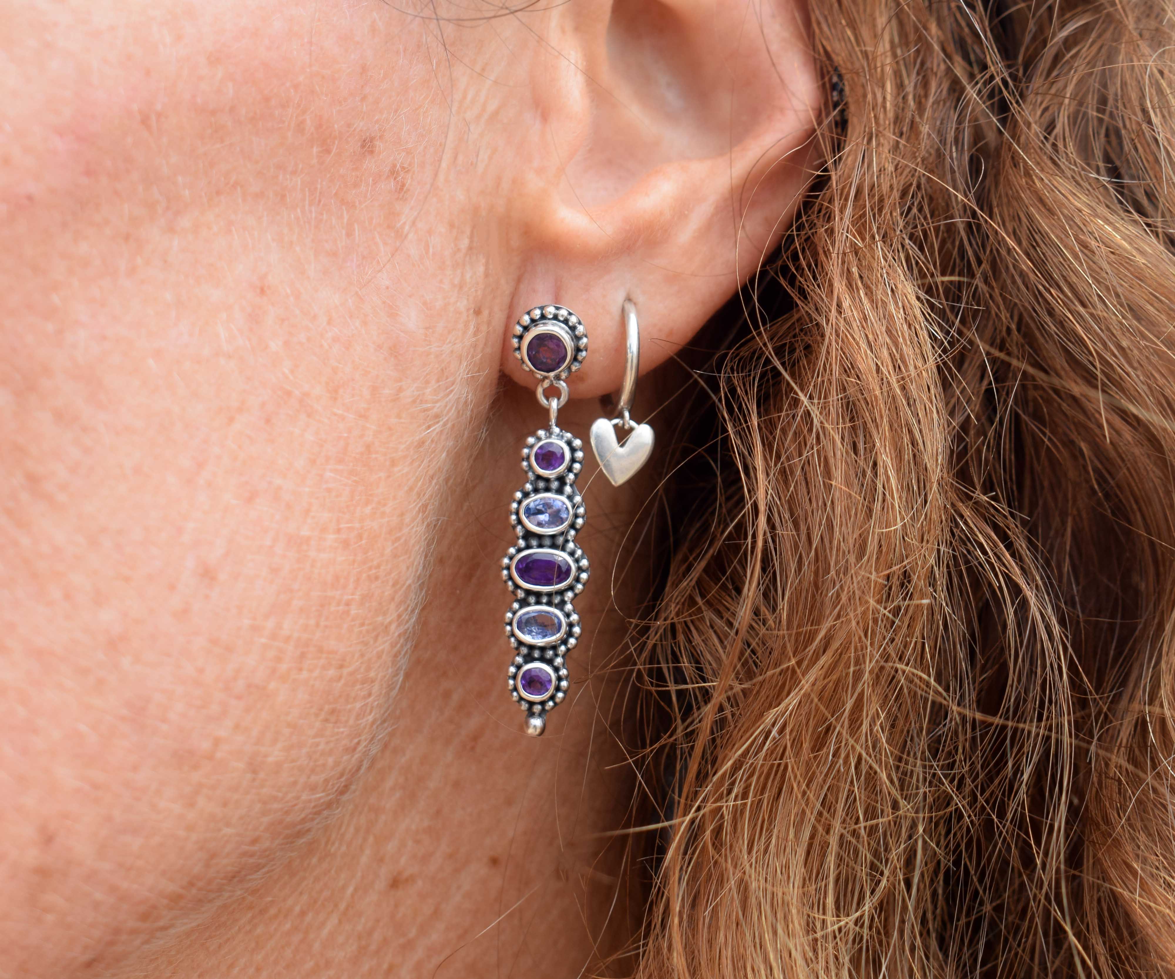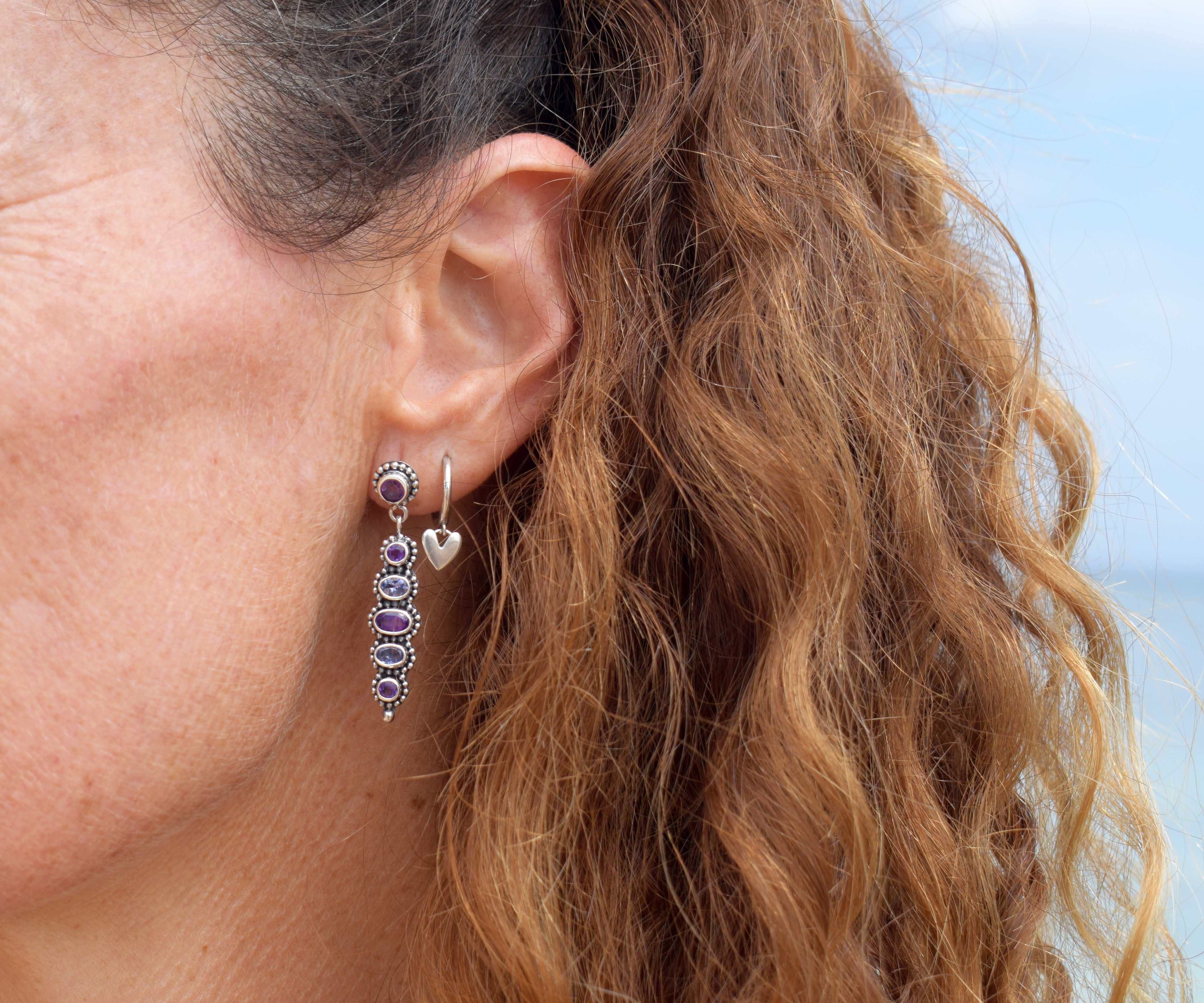 El vástago de estos aros es una Amatista, también rodeada de pequeñas bolitas de plata, se unen con una argolla, lo que le da un lindo movimiento a estos aros tipo cascada de piedras.