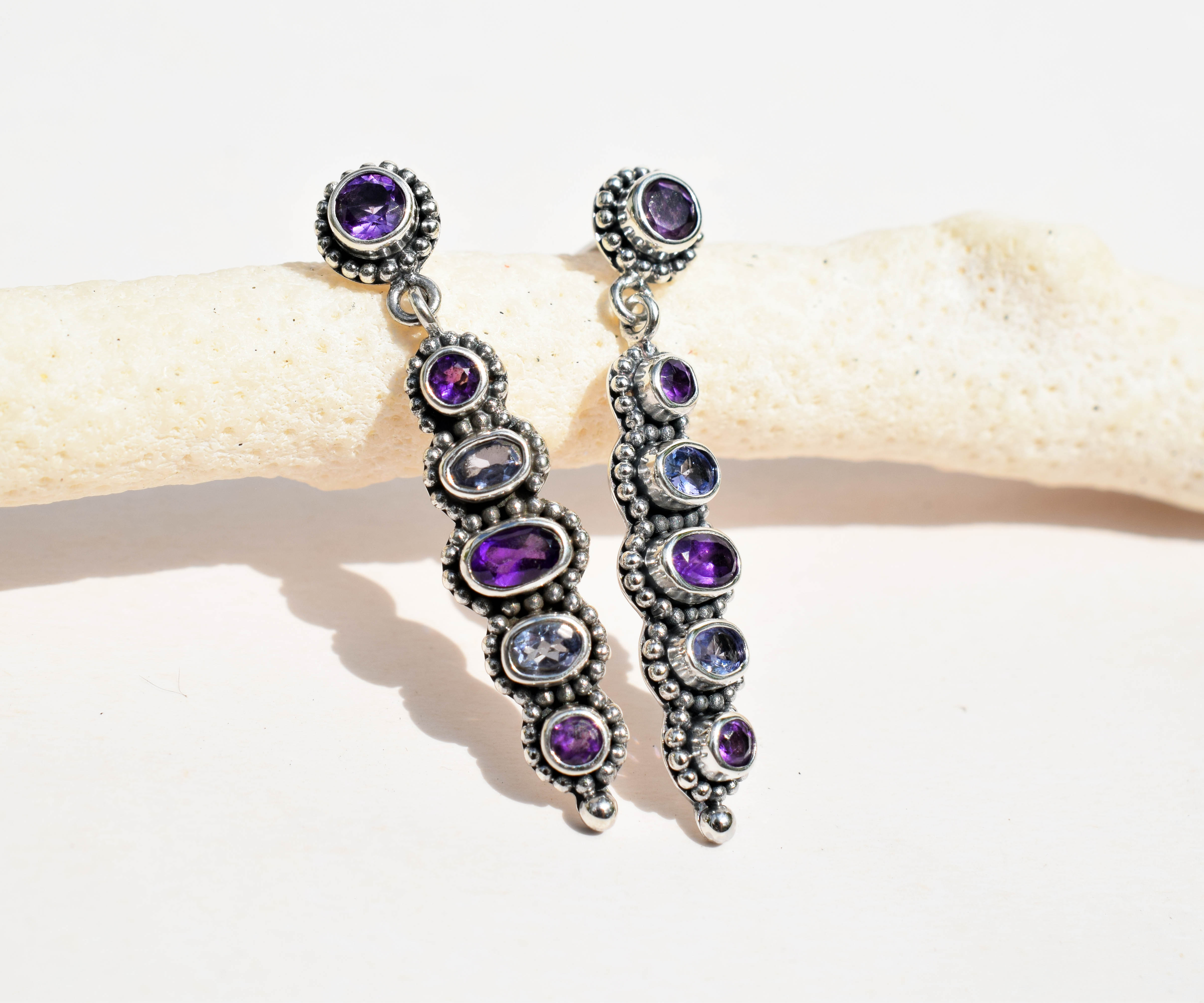 Amatistas en el centro, rodeadas de gránulos de plata, la siguen dos Tanzanitas y luego otras pequeñas Amatistas, que combinan perfectamente y hacen resaltar la piedra central.