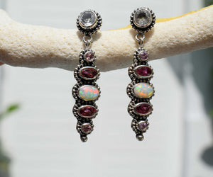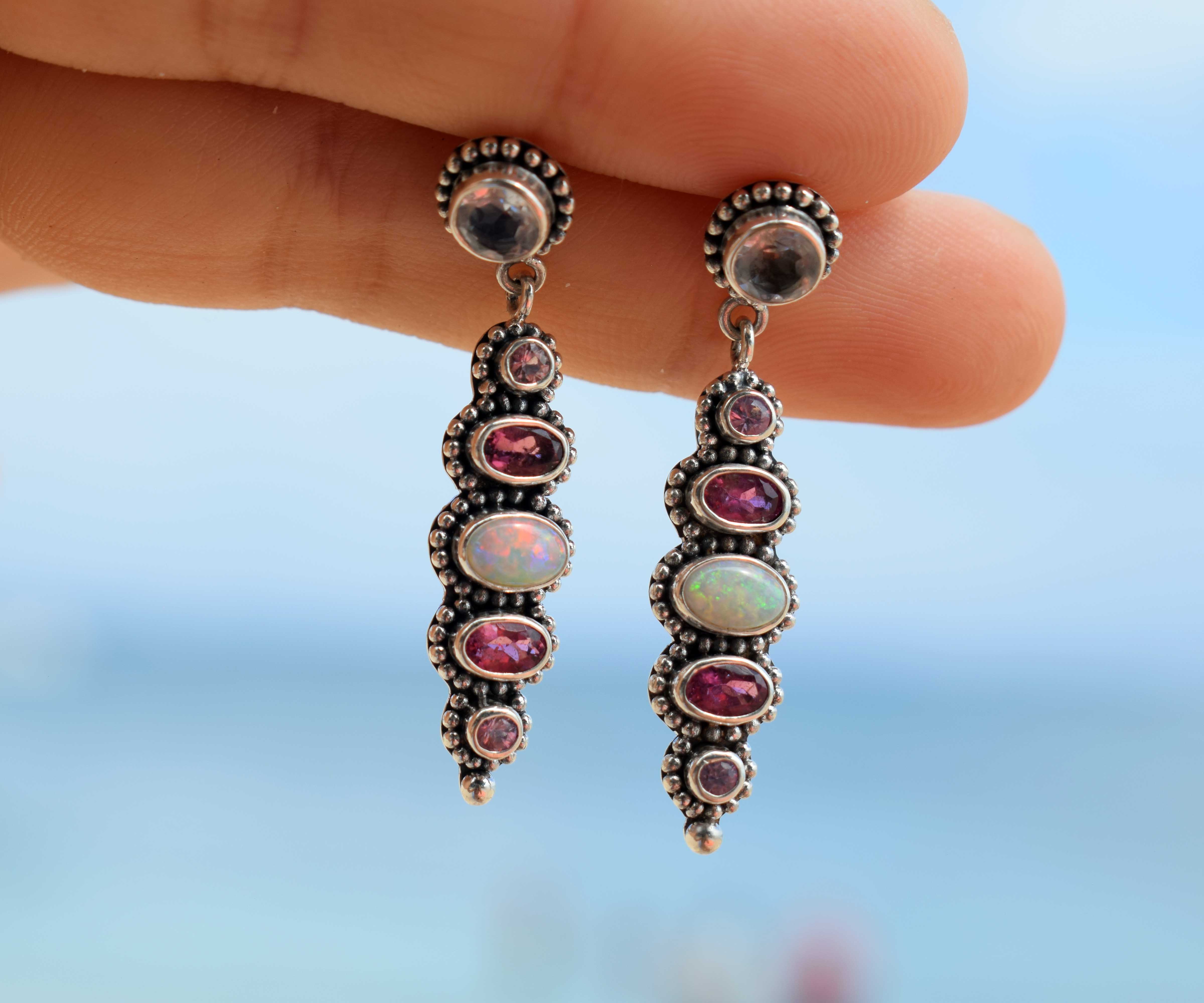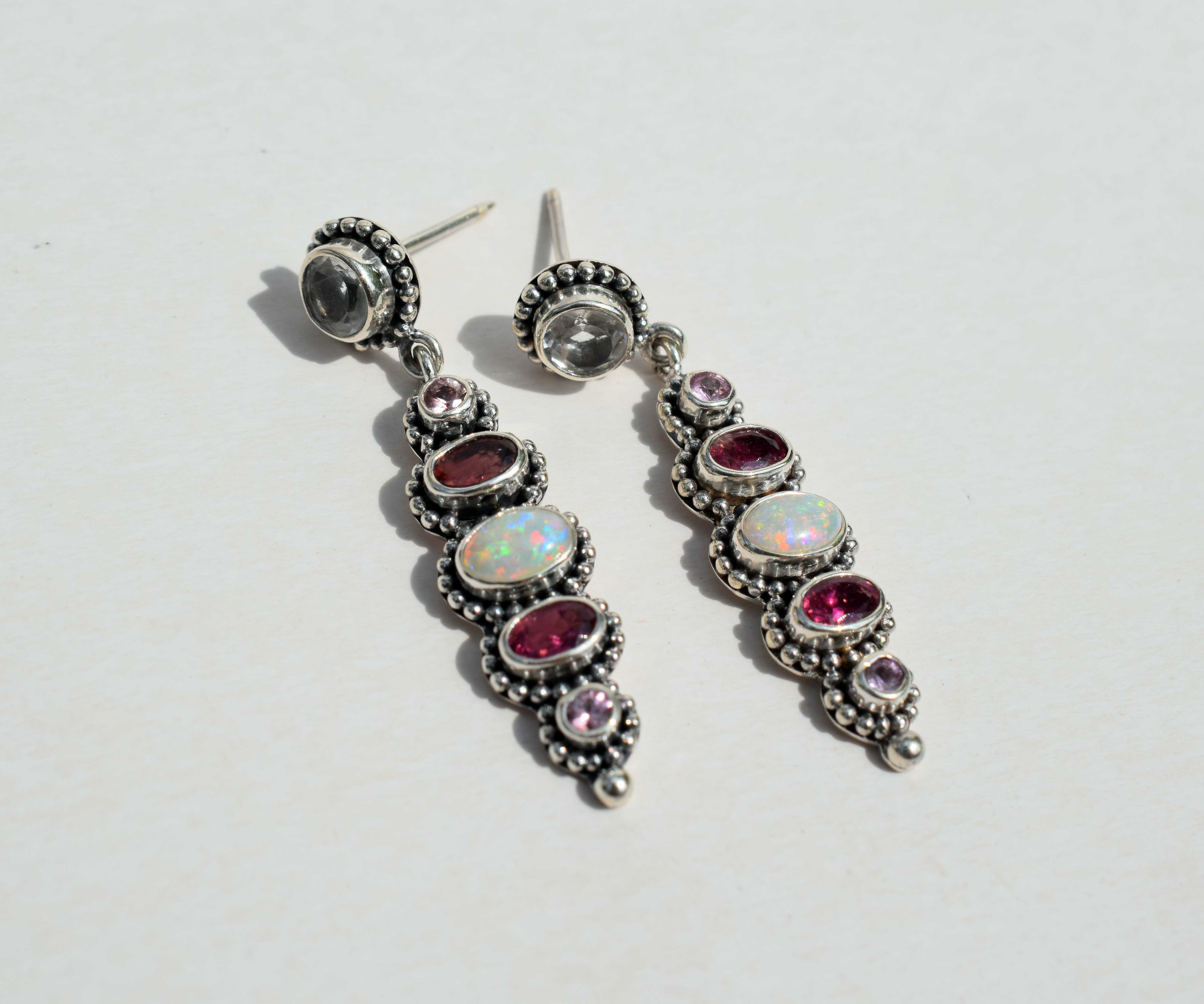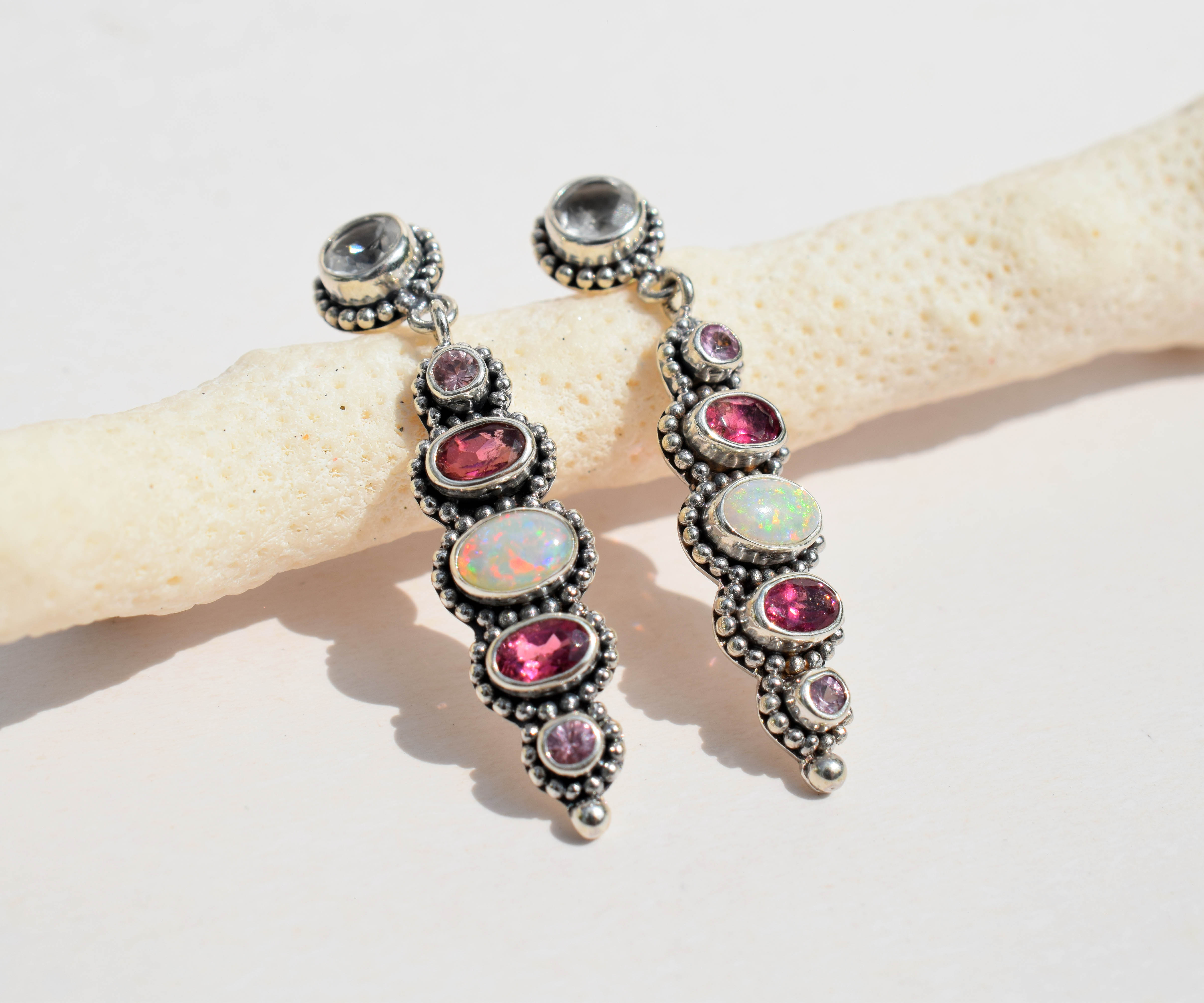 Ópalos Australianos en el centro, rodeados de gránulos de plata, la siguen dos Turmalinas y luego unos brillantes Zafiros rosados, que combinan perfectamente y hacen resaltar los brillos en tonos rosas del Ópalo.