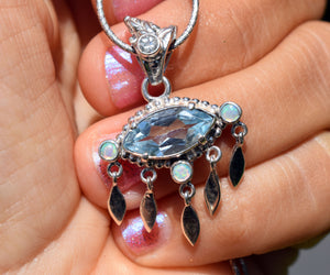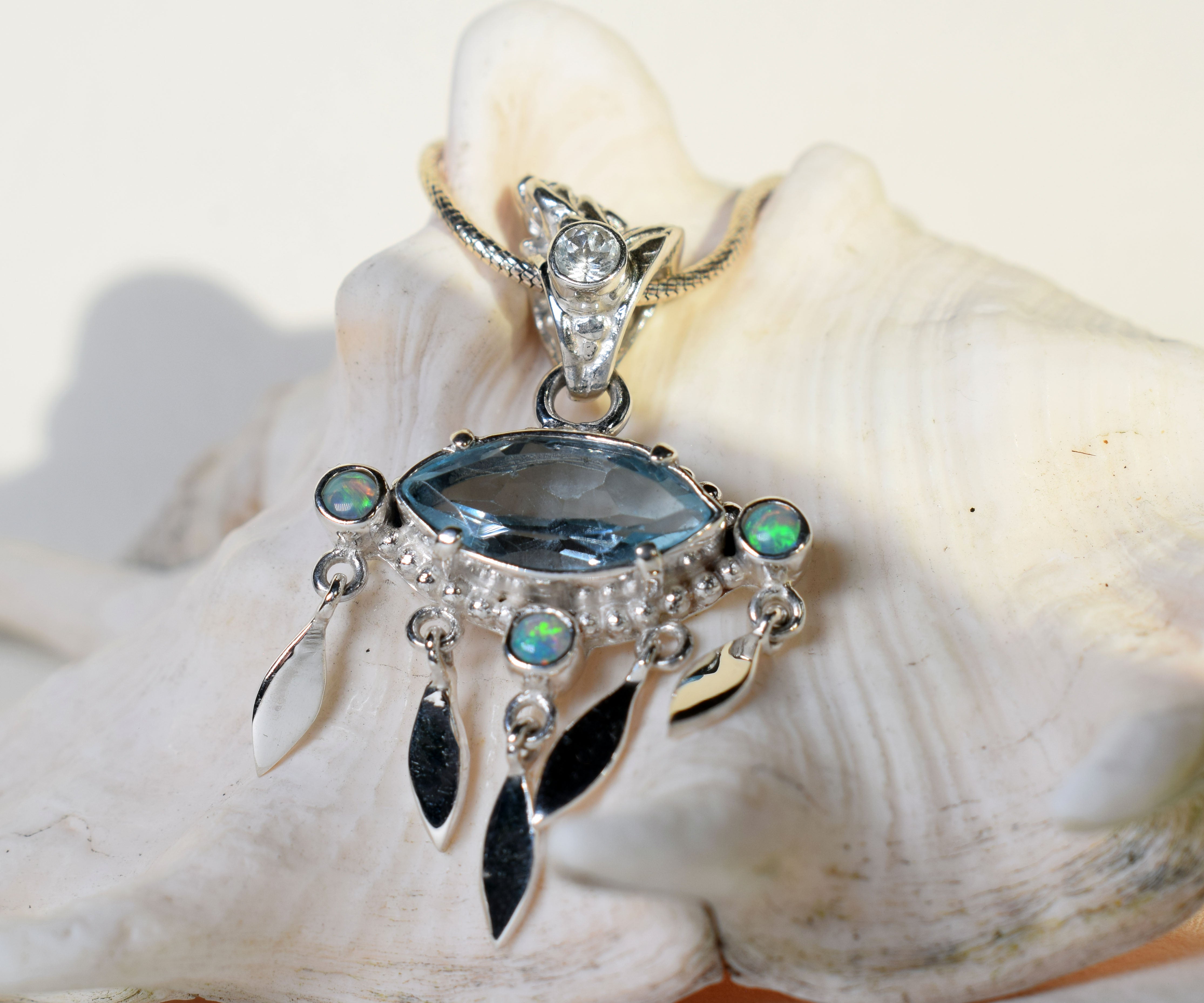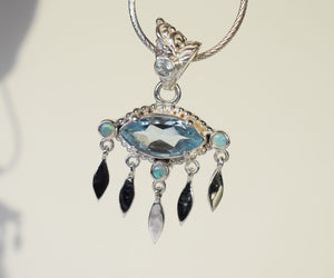 Un Topacio celeste clarito en forma de ojo y  Ópalos Australianos con destellos multicolores son las piedras que escogí para este colgante en los colores del mar.