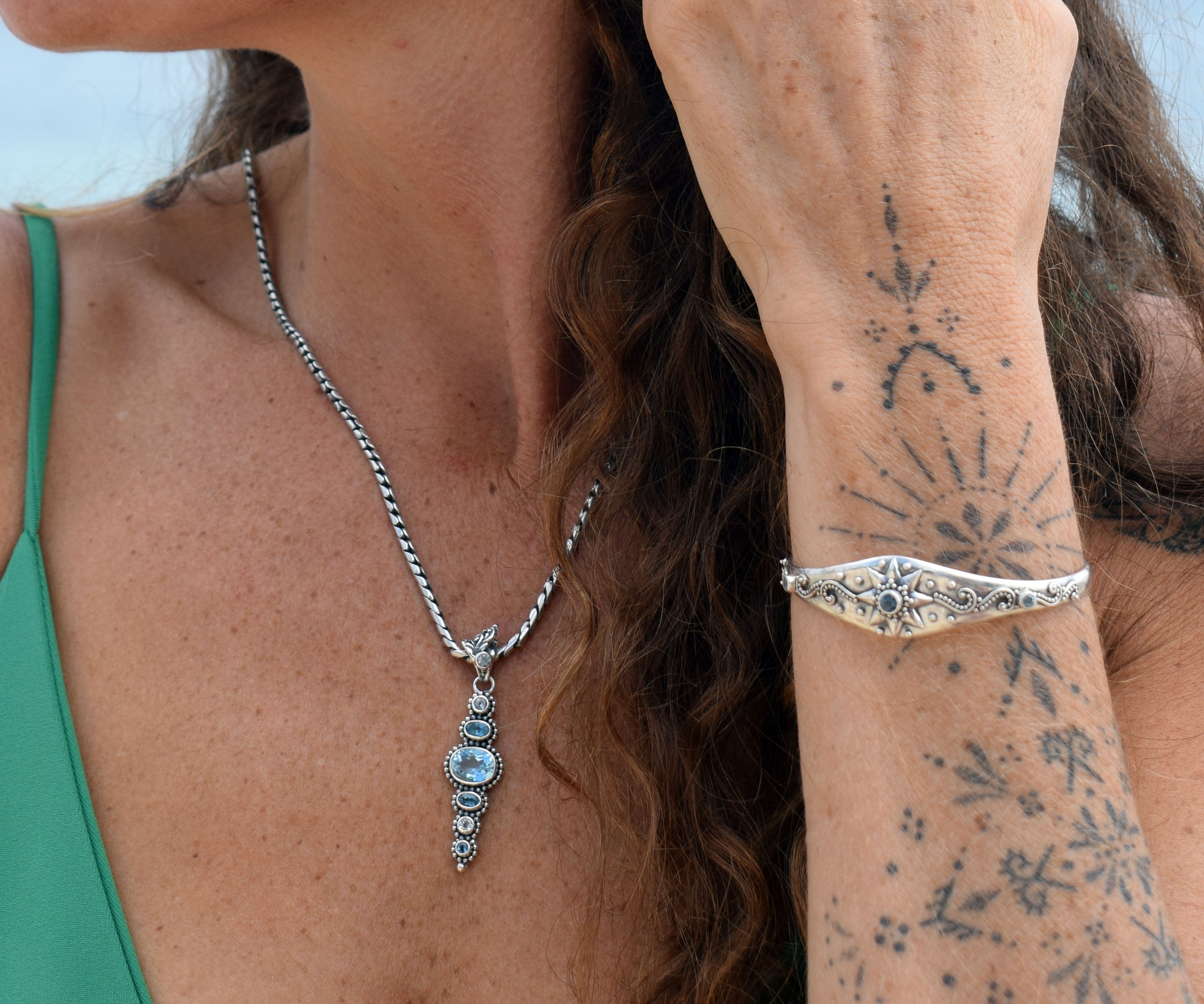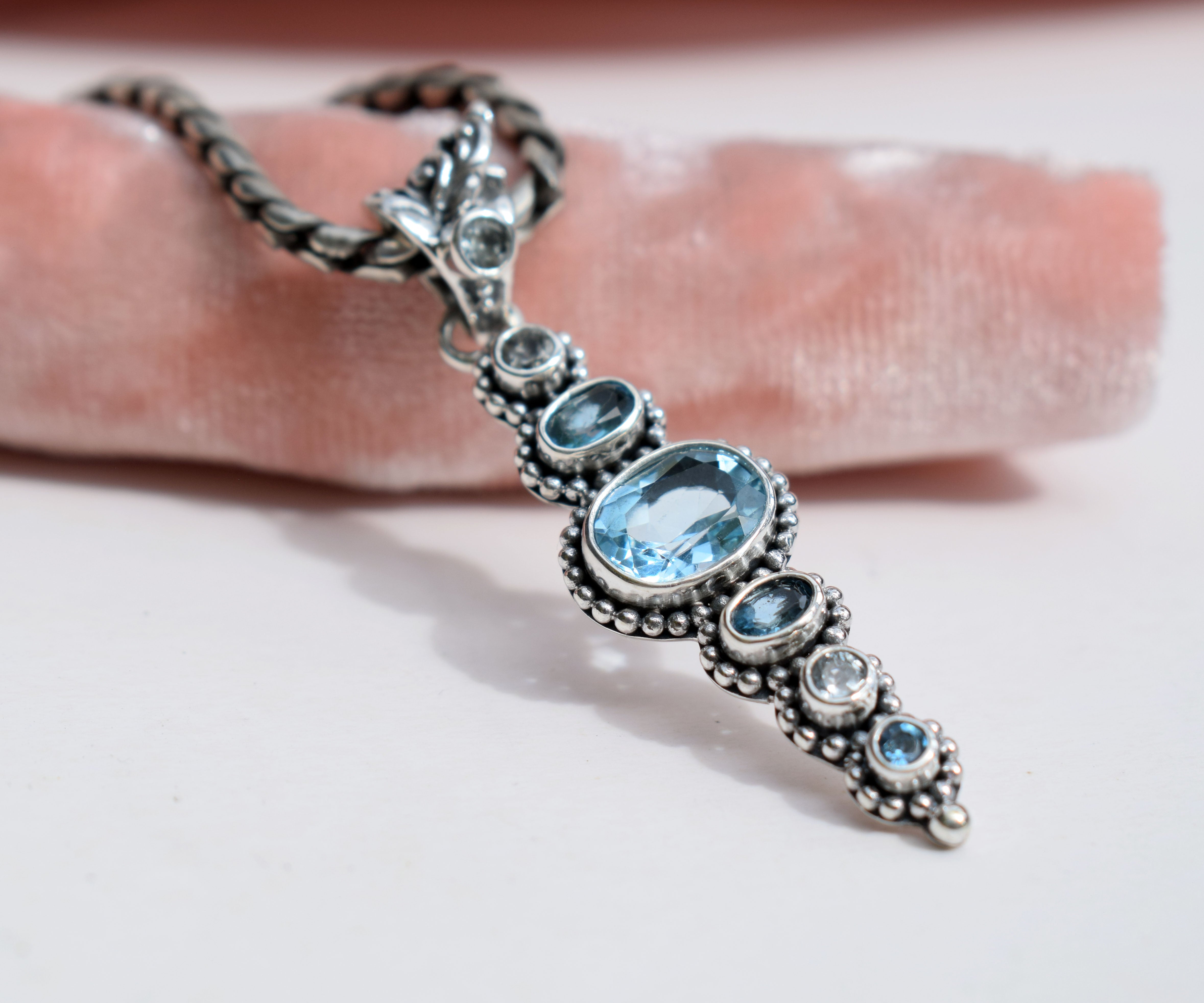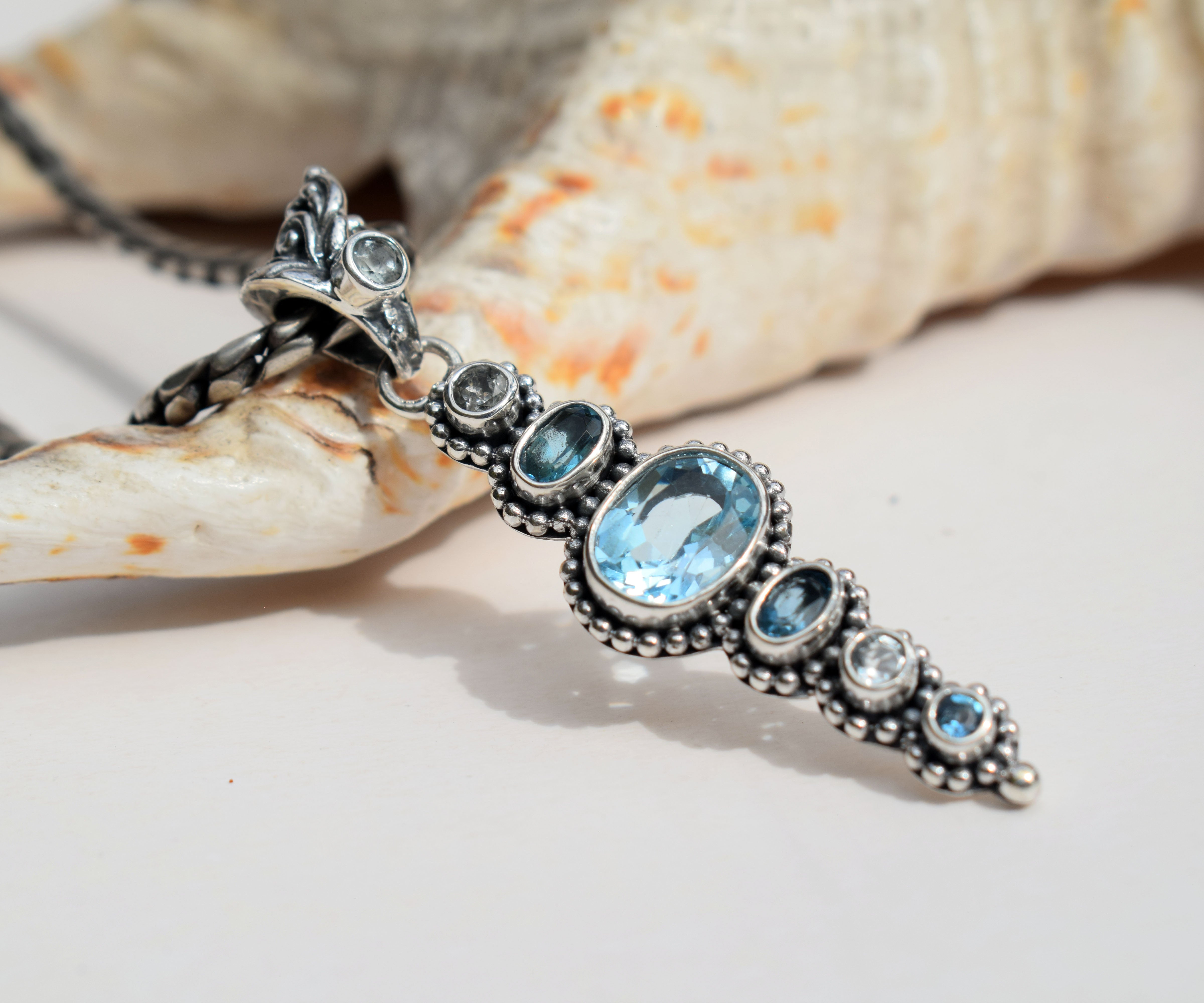 Un hermoso Topacio Sky Blue Oval en el centro, rodeado de gránulos de plata, le siguen otros Topacios en distintos tonos, la ultima piedra es una bella Aguamarina Santa maria que se caracterizan por su color intenso. Una combinación de tonos marinos que hacen este colgante un tesoro como sacado del mar.