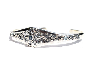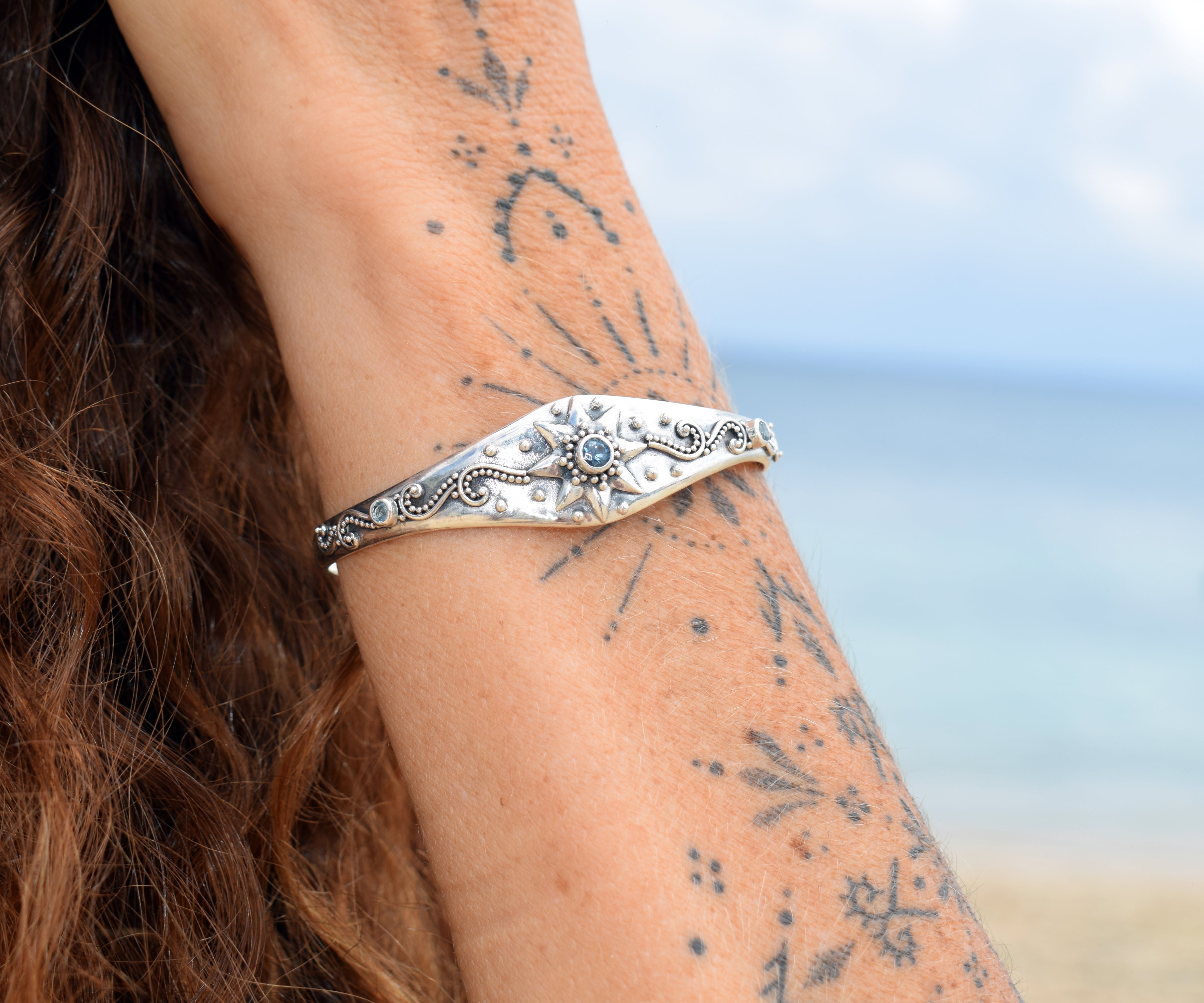 Una pulsera cósmica con una Venus y un hermoso Zafiro que brilla en el centro, de ella nacen orgánicos rayos de luz hechos en filigrana de plata.